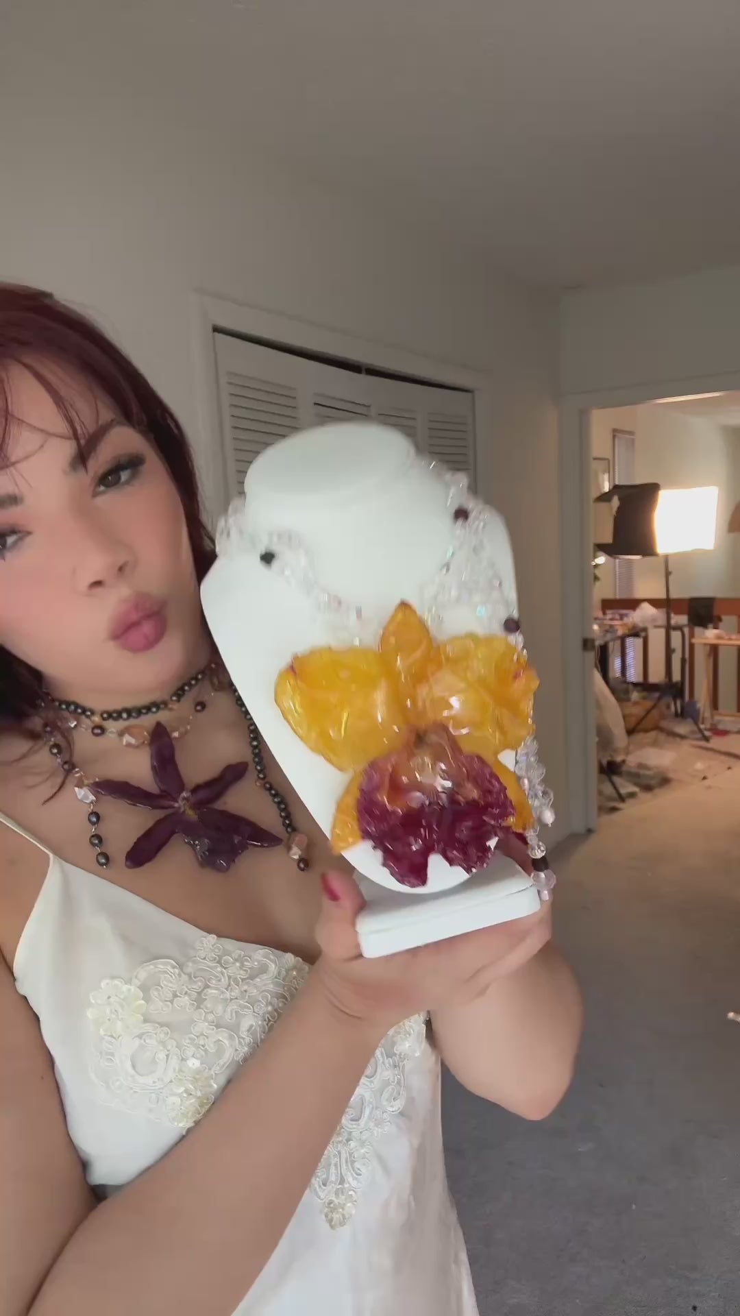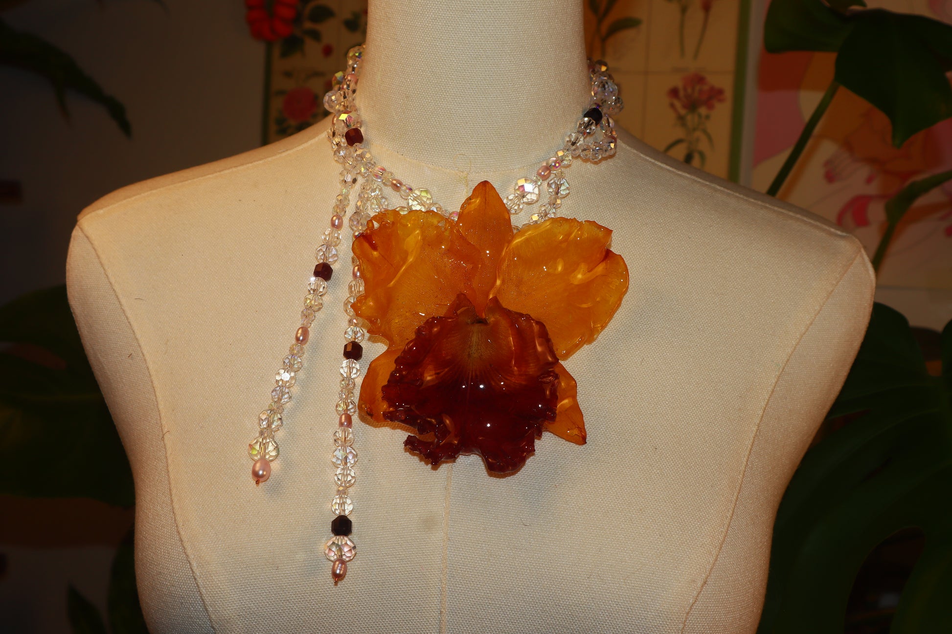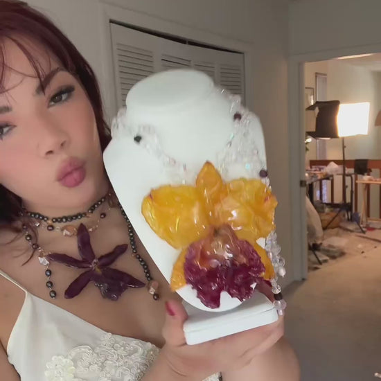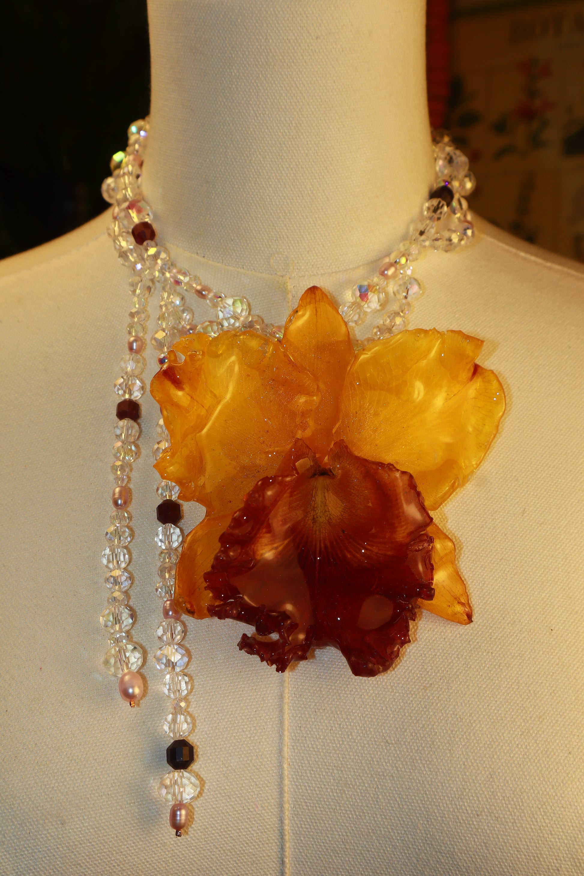 Cattleya Amarilla y Roja Gigante conservada en resina, perlas naturales de aguadulce, cuentas de vidrio, granate