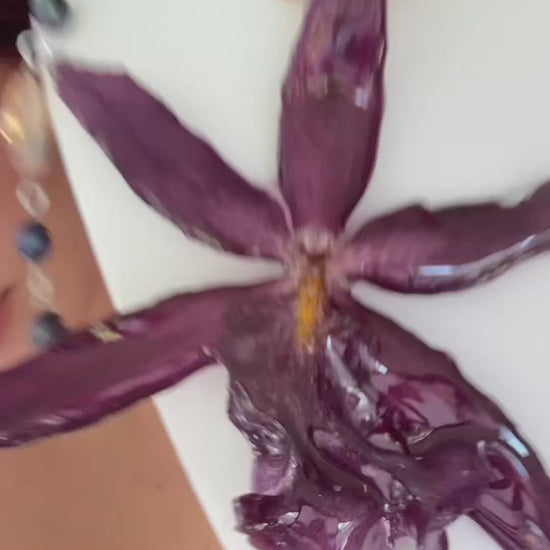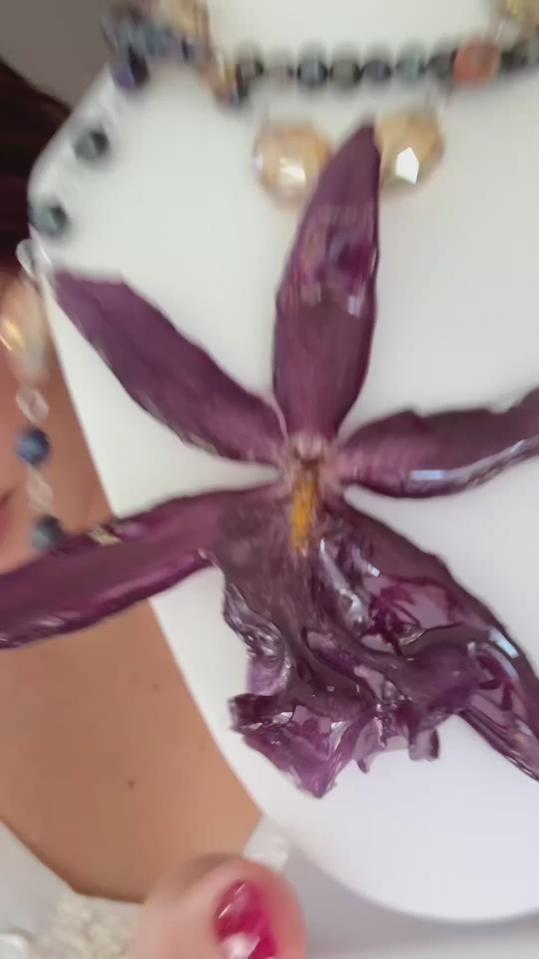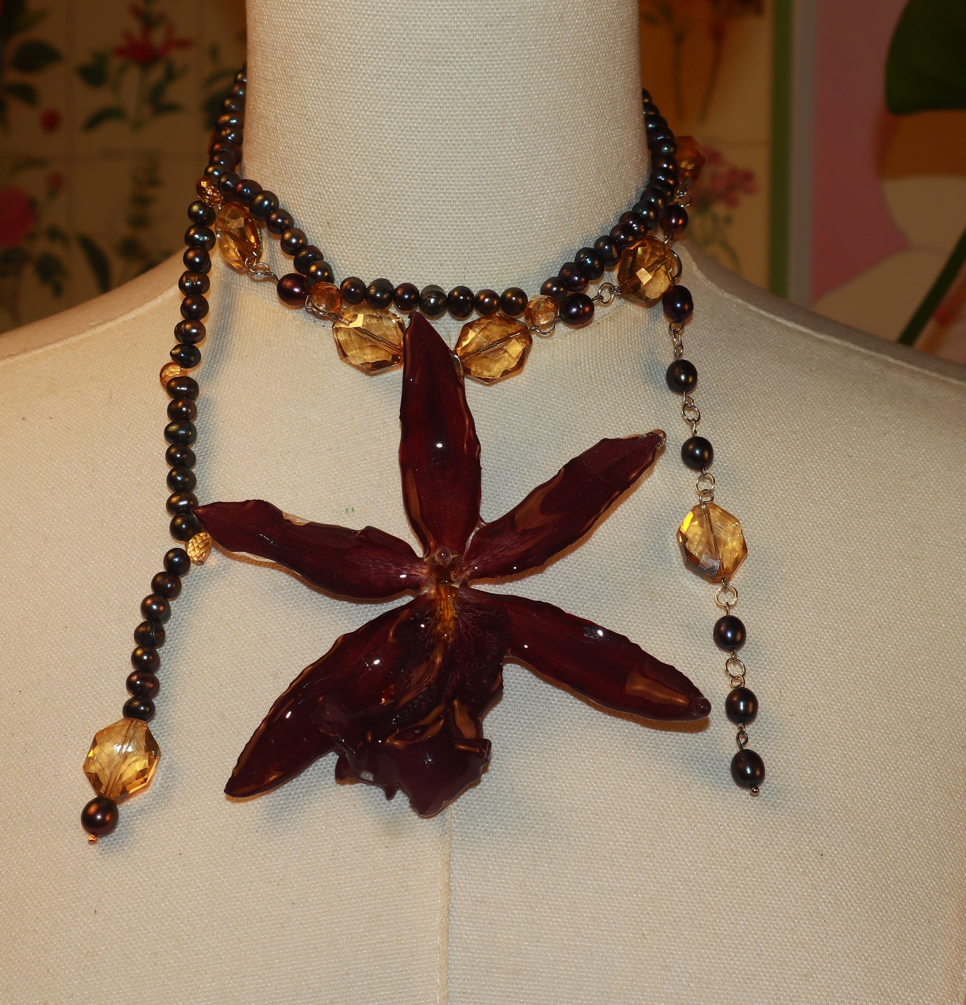 Orquídea Híbrida Exótica conservada en resina, perlas naturales de aguadulce color pavo real, perlas de vidrio.