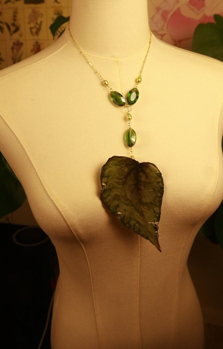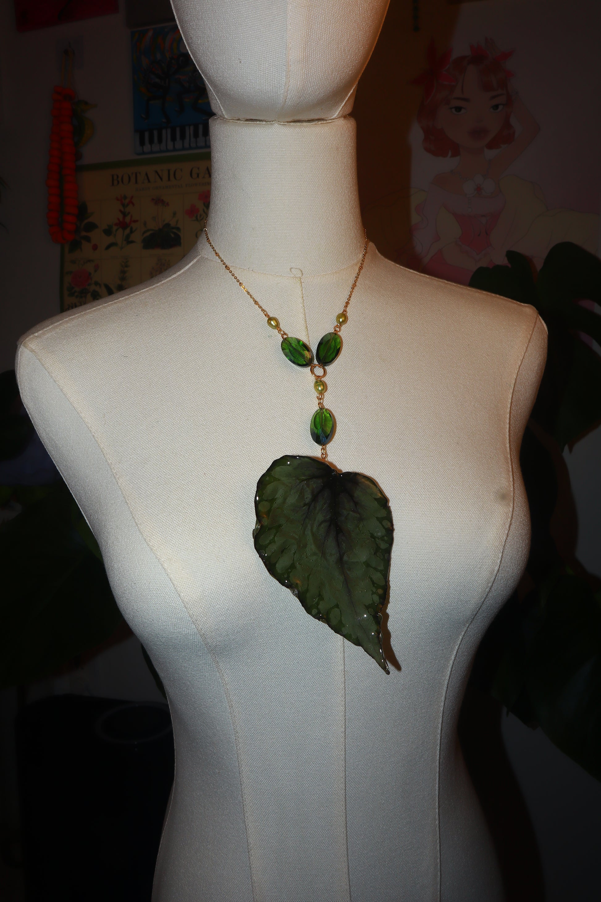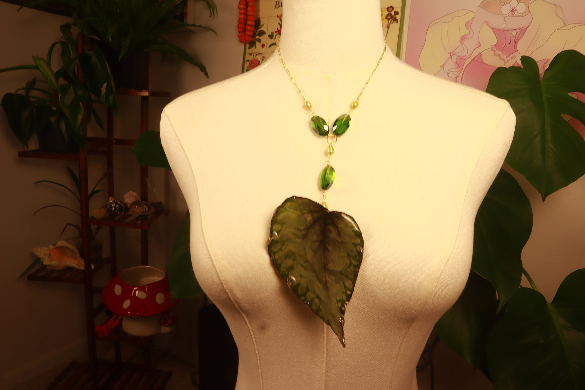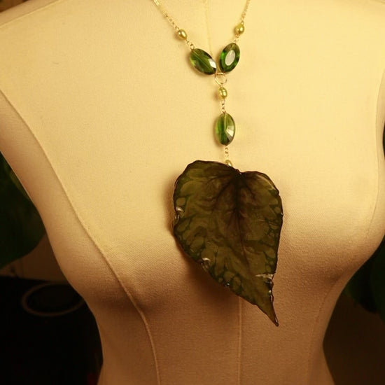 Perlas de aguadulce tonos verdes, cuentas de vidrio & Hoja de Begonia conservada en Resina