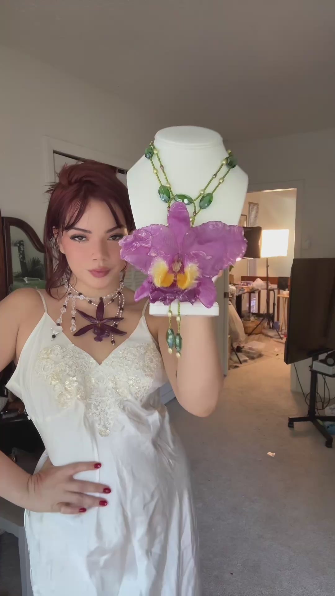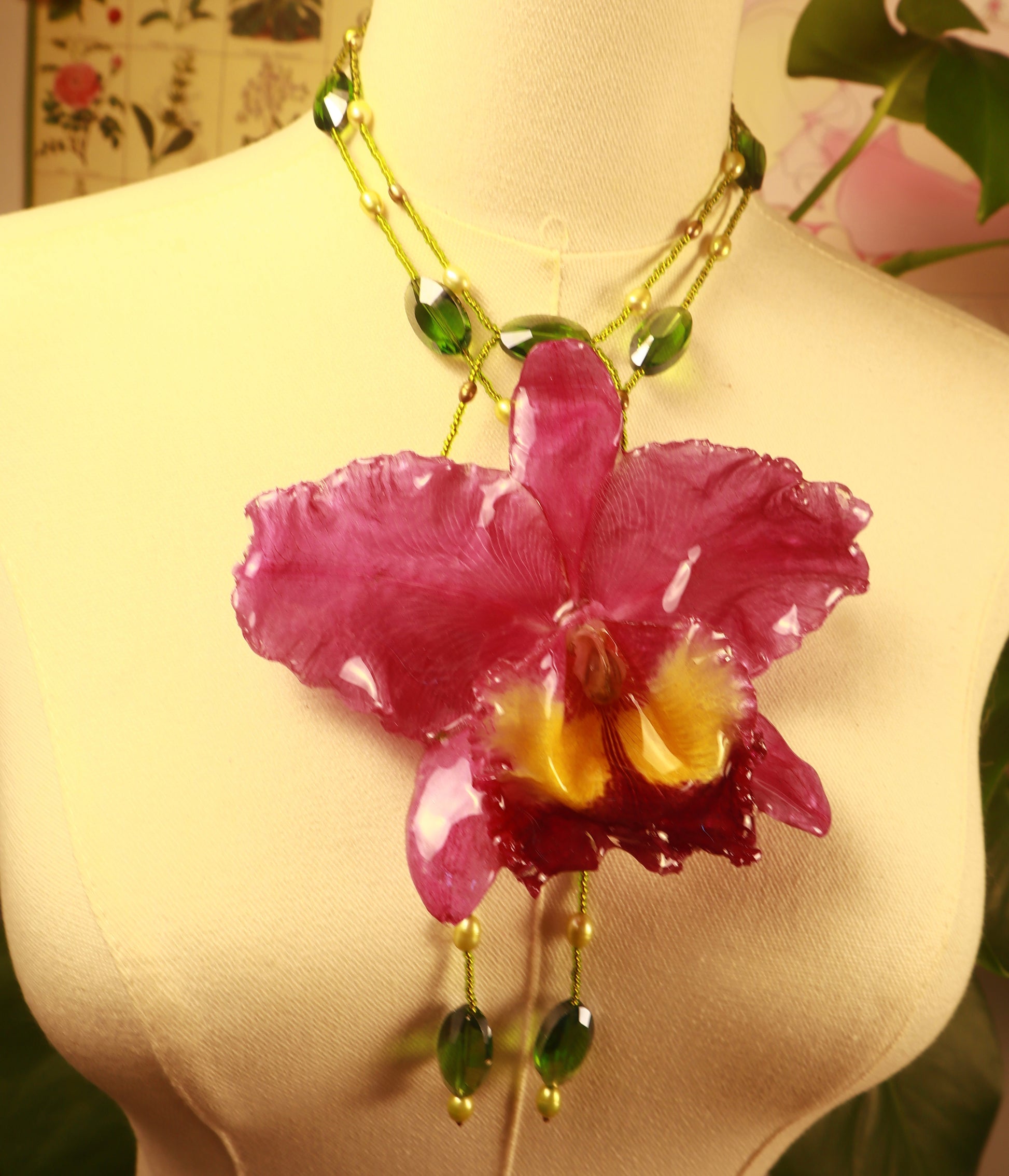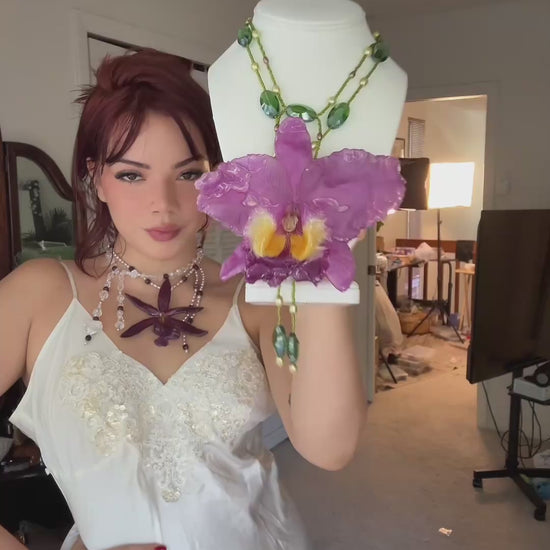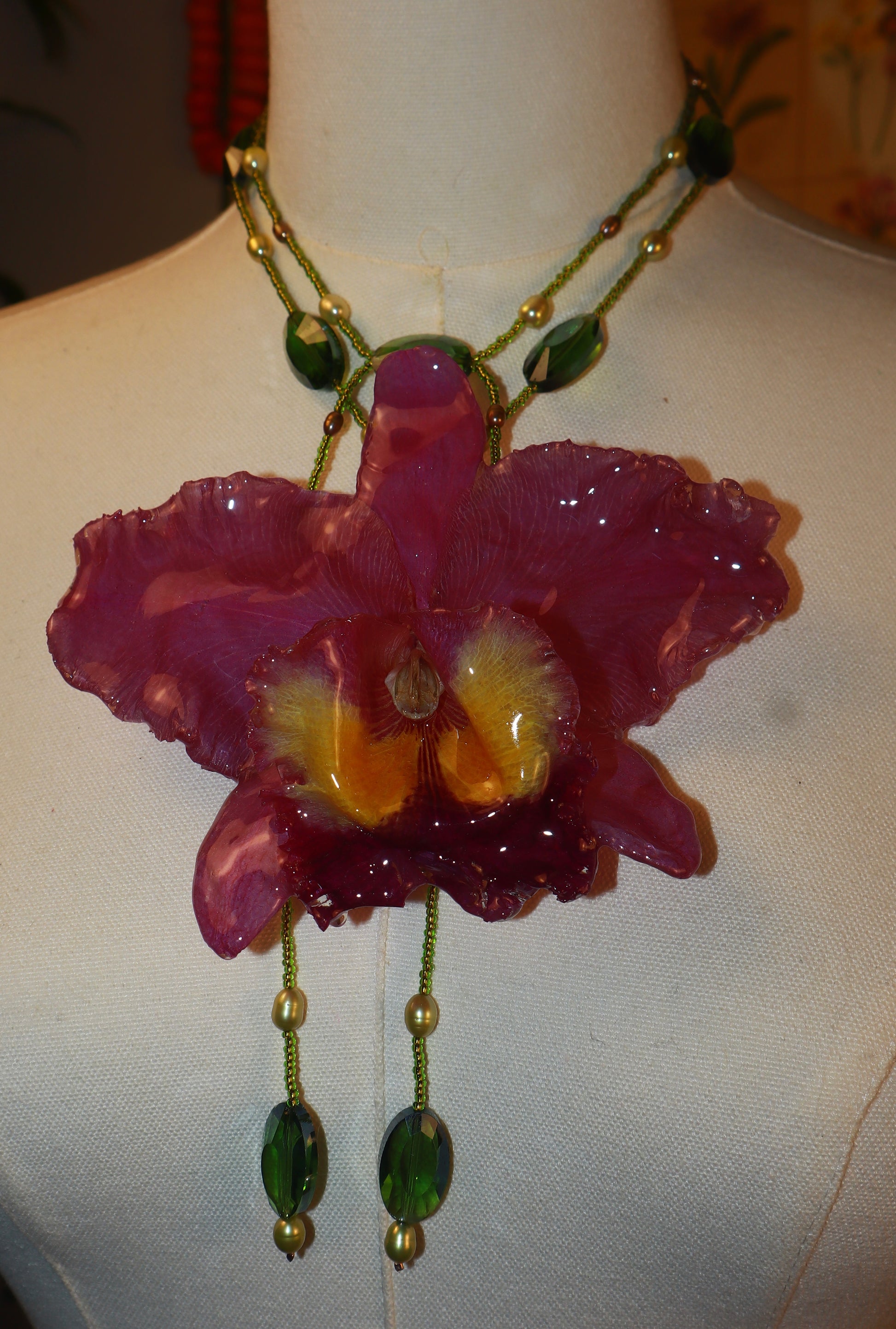 Cattleya Gigante conservada en resina, perlas de aguadulce en tonos verdes y oliva, cuentas de vidrio.