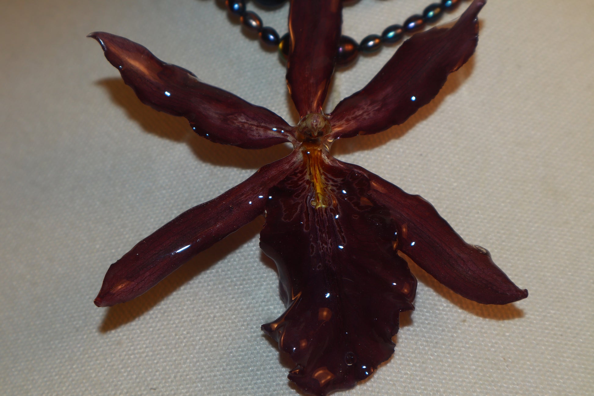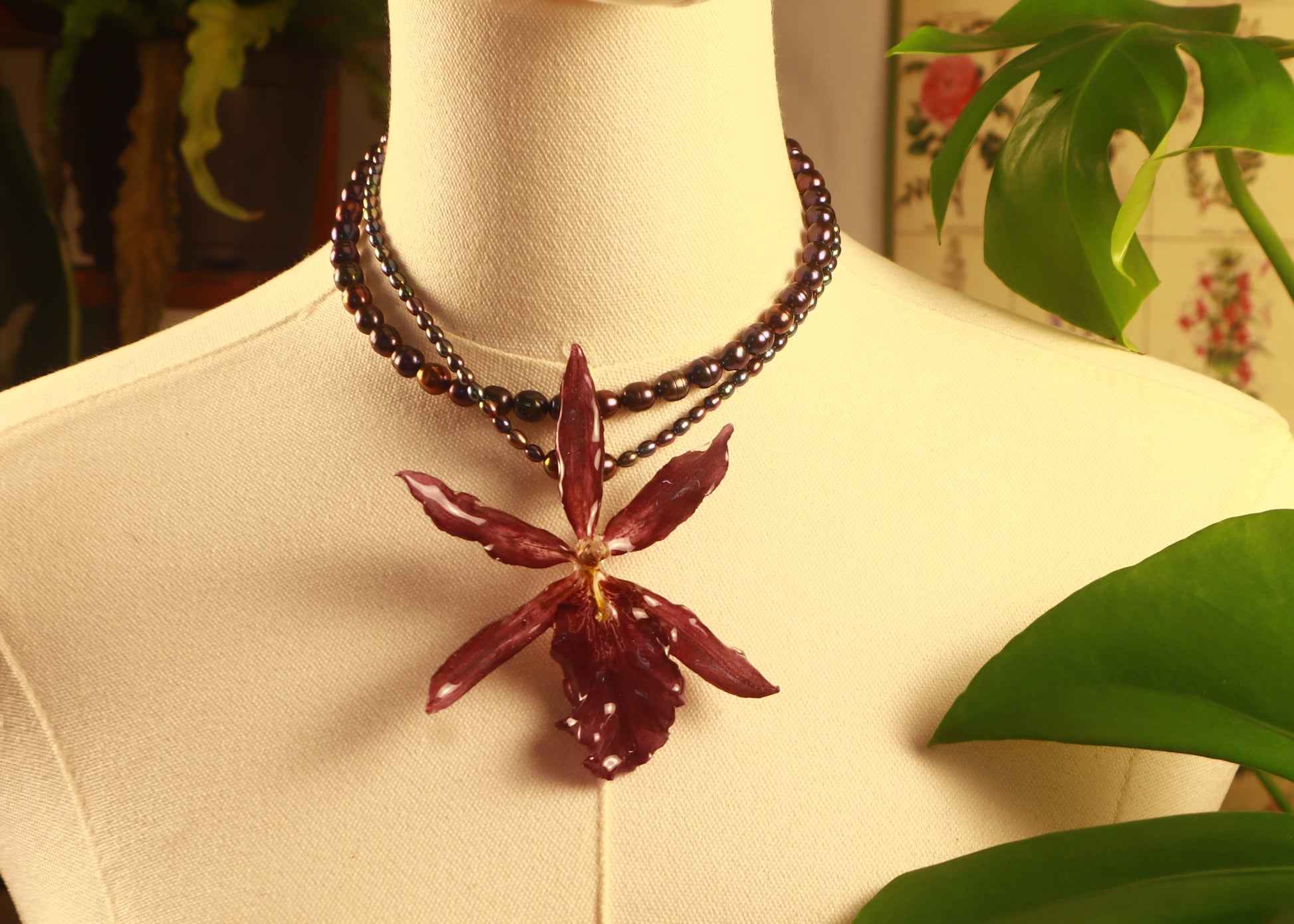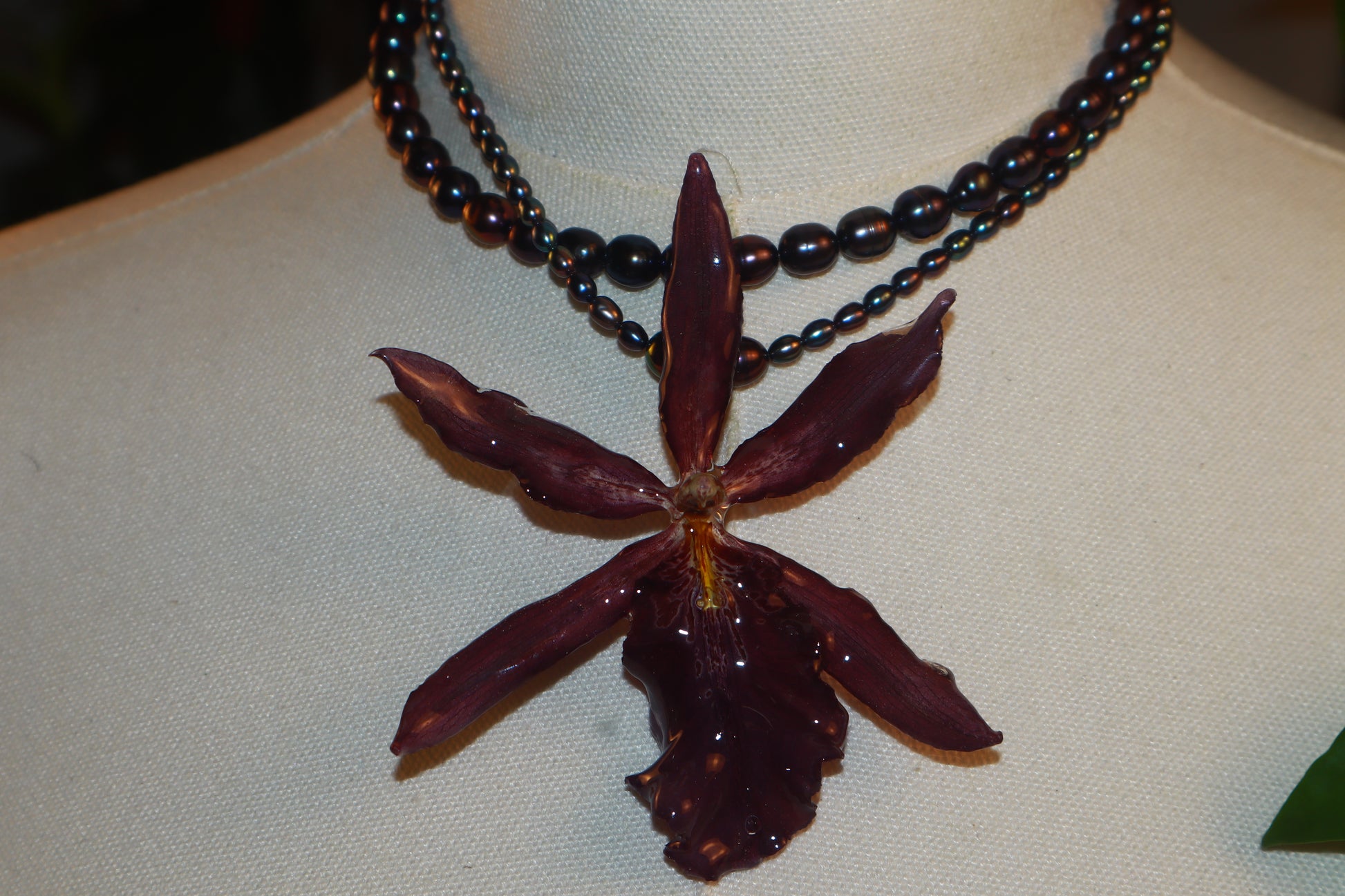 Perlas de aguadulce de diferentes tamaños color pavo real, Orquídea ( Odontoglossum )