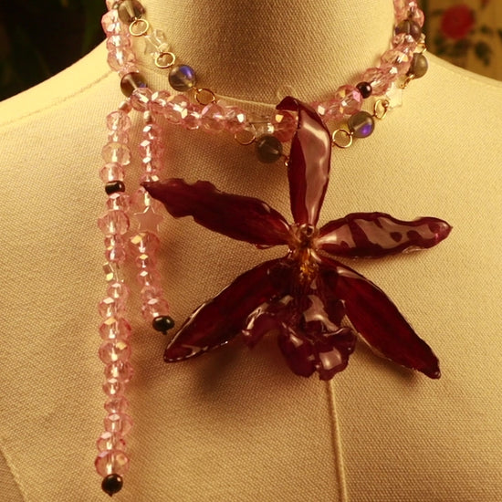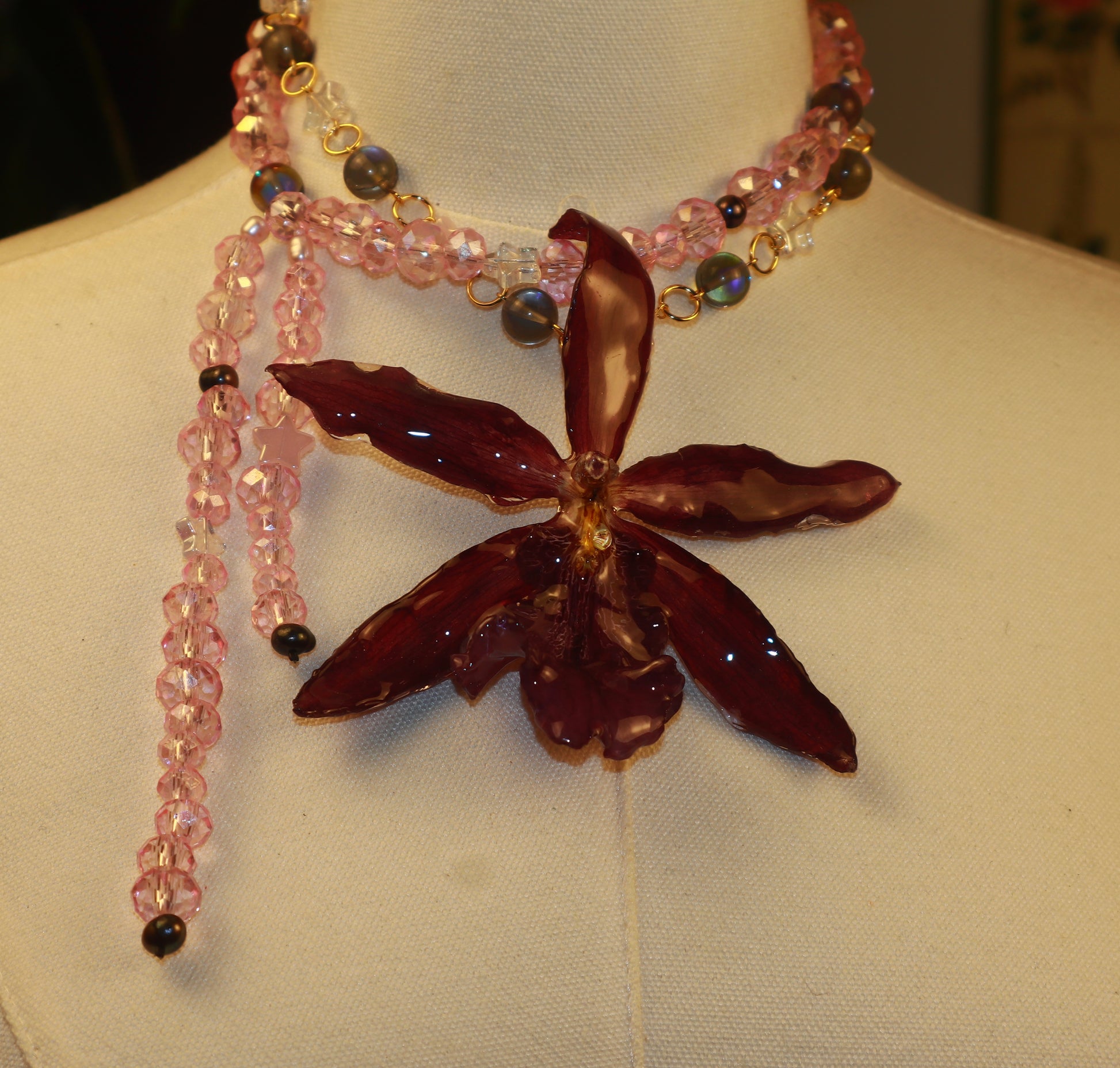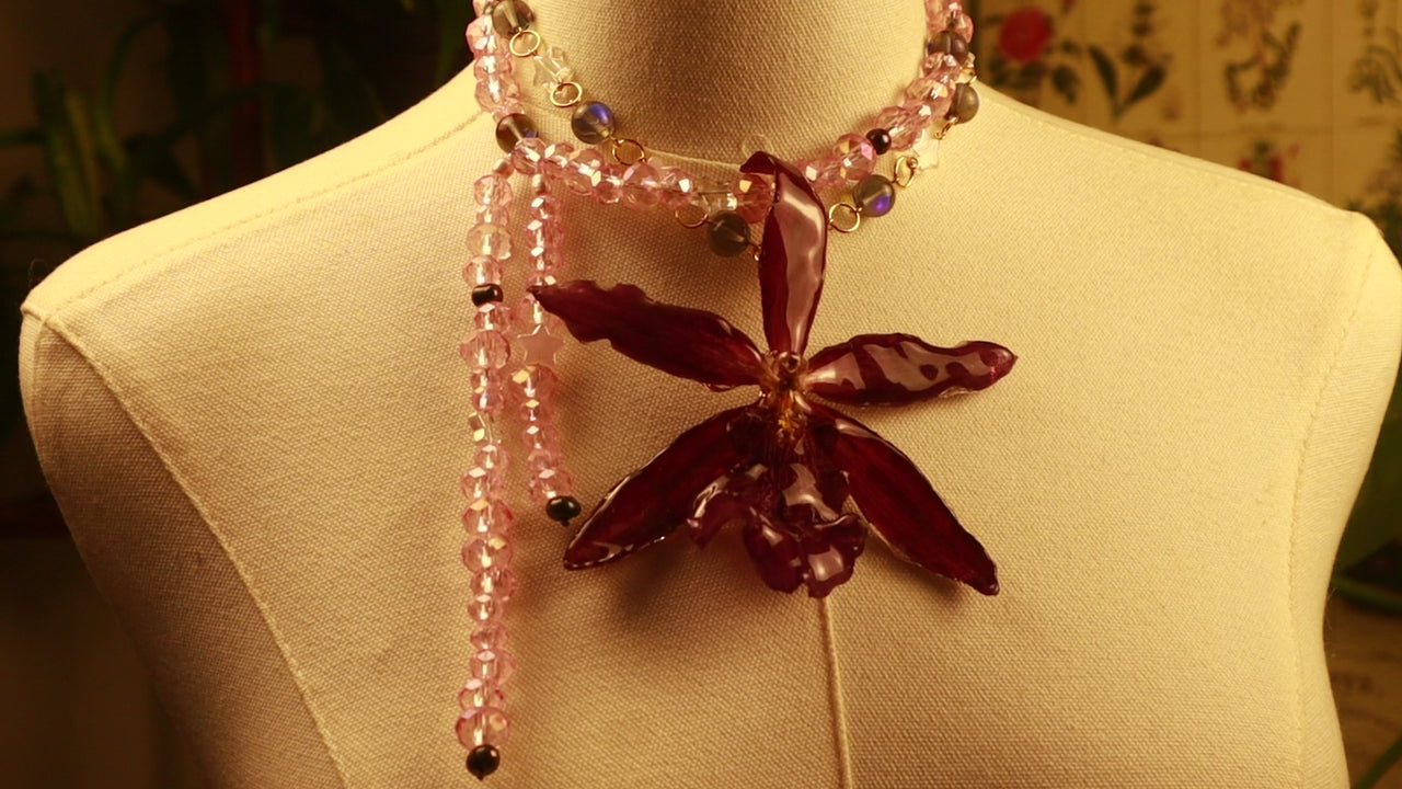 Orquídea Exótica, cuentas de vidrio, perlas de aguadulce color pavo real