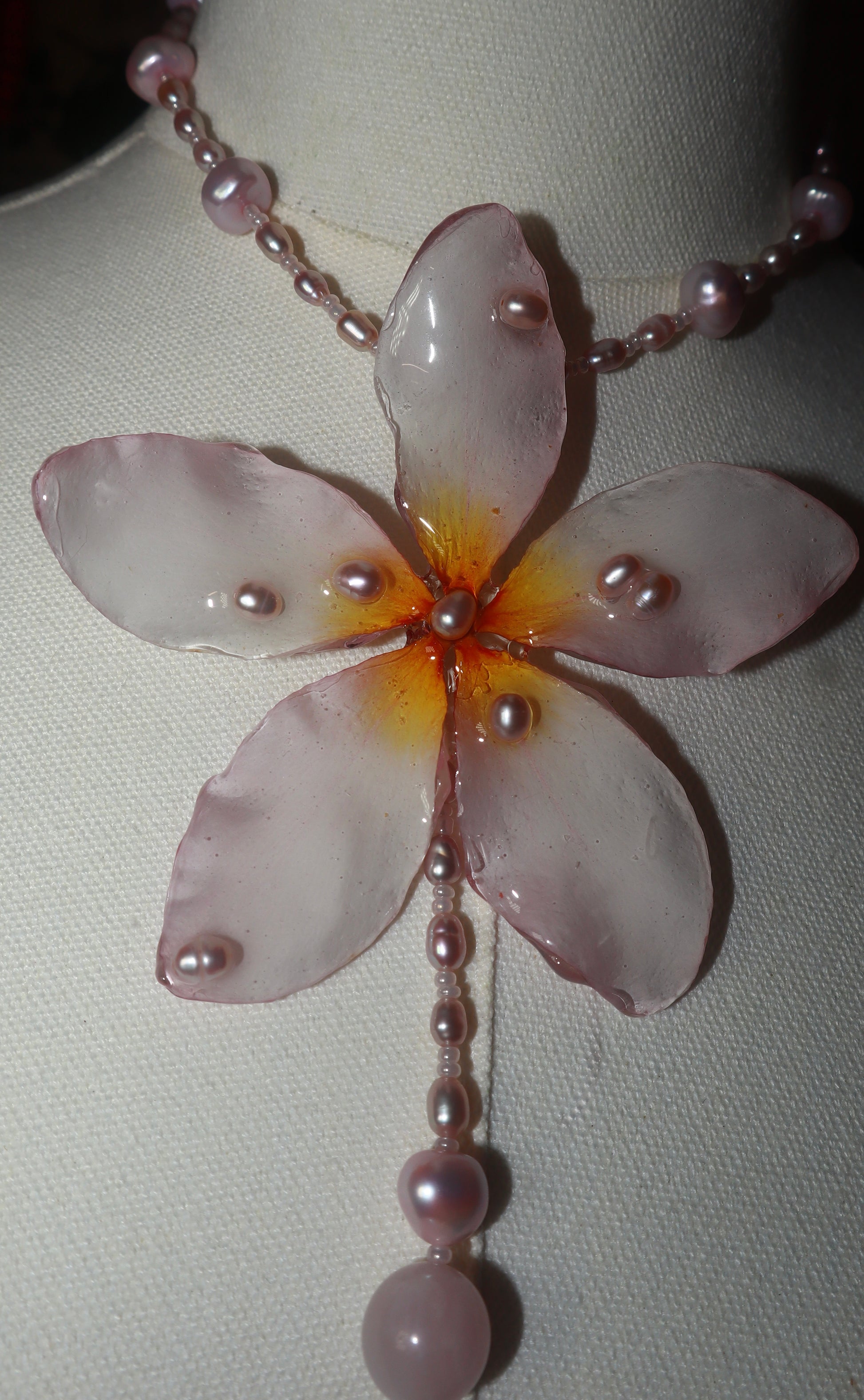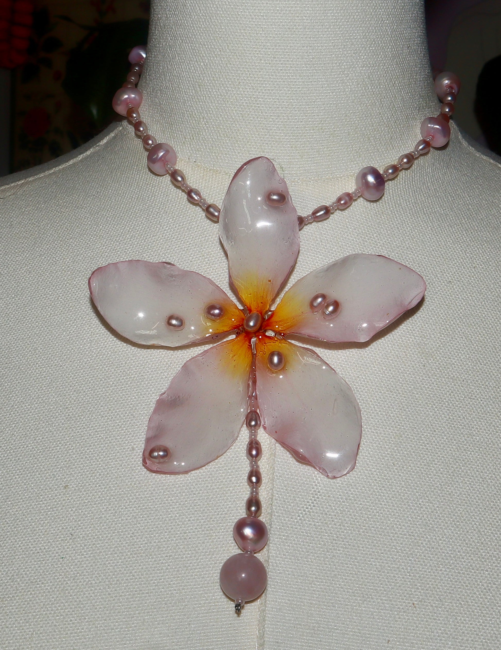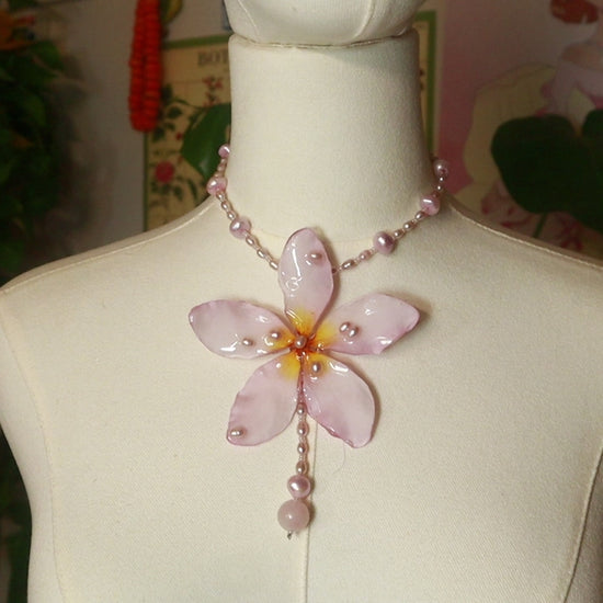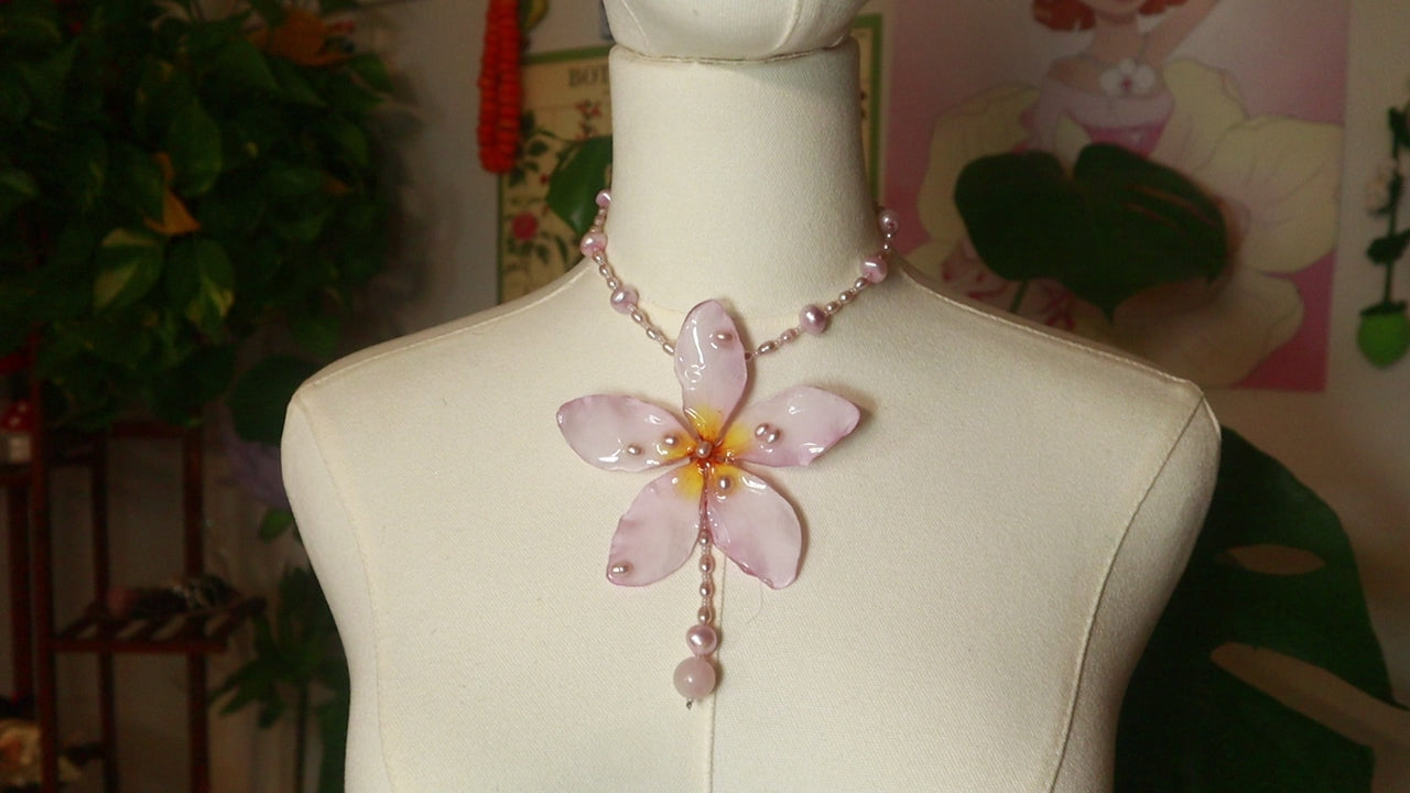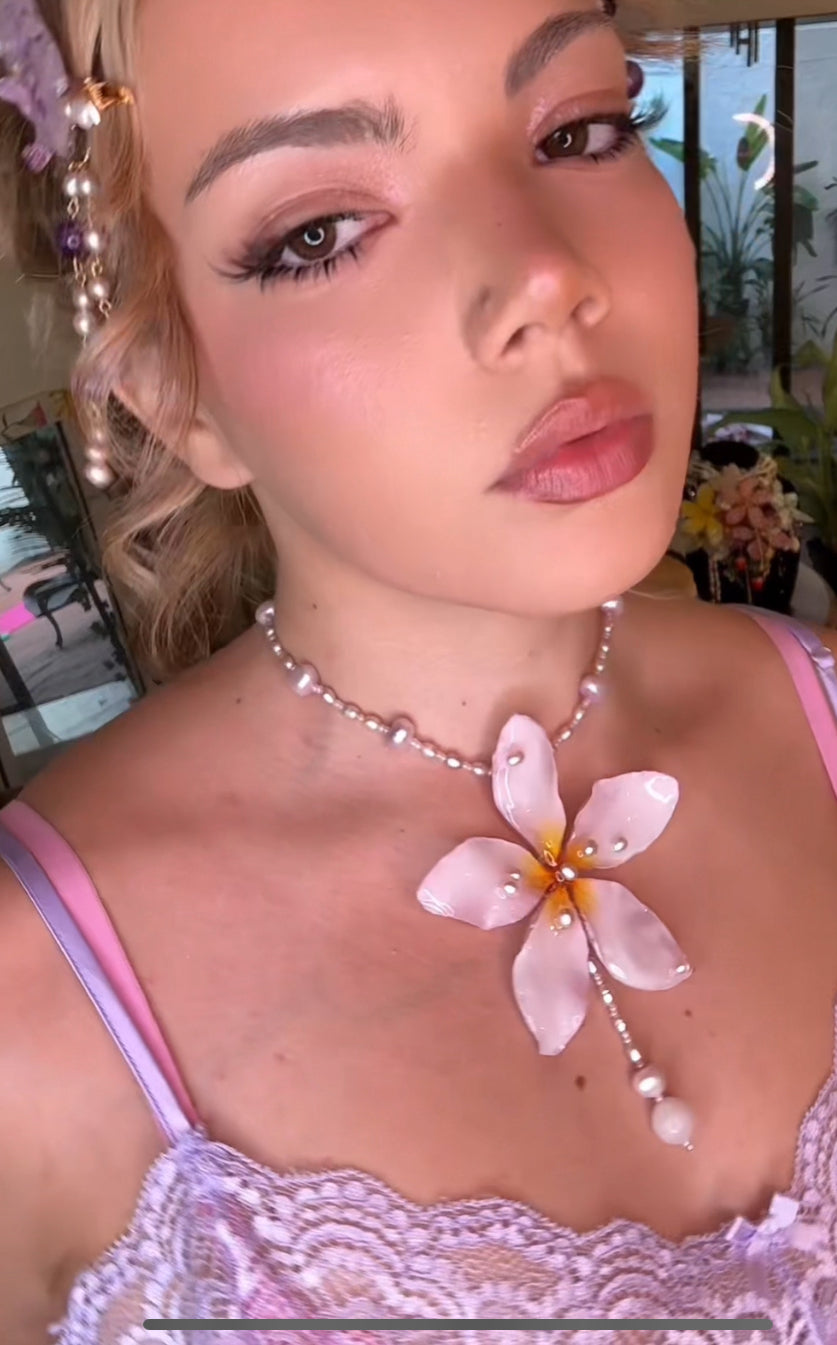 Plumeria real conservada en resina, trabajada artesanalmente durante varios días para crear una pieza única.