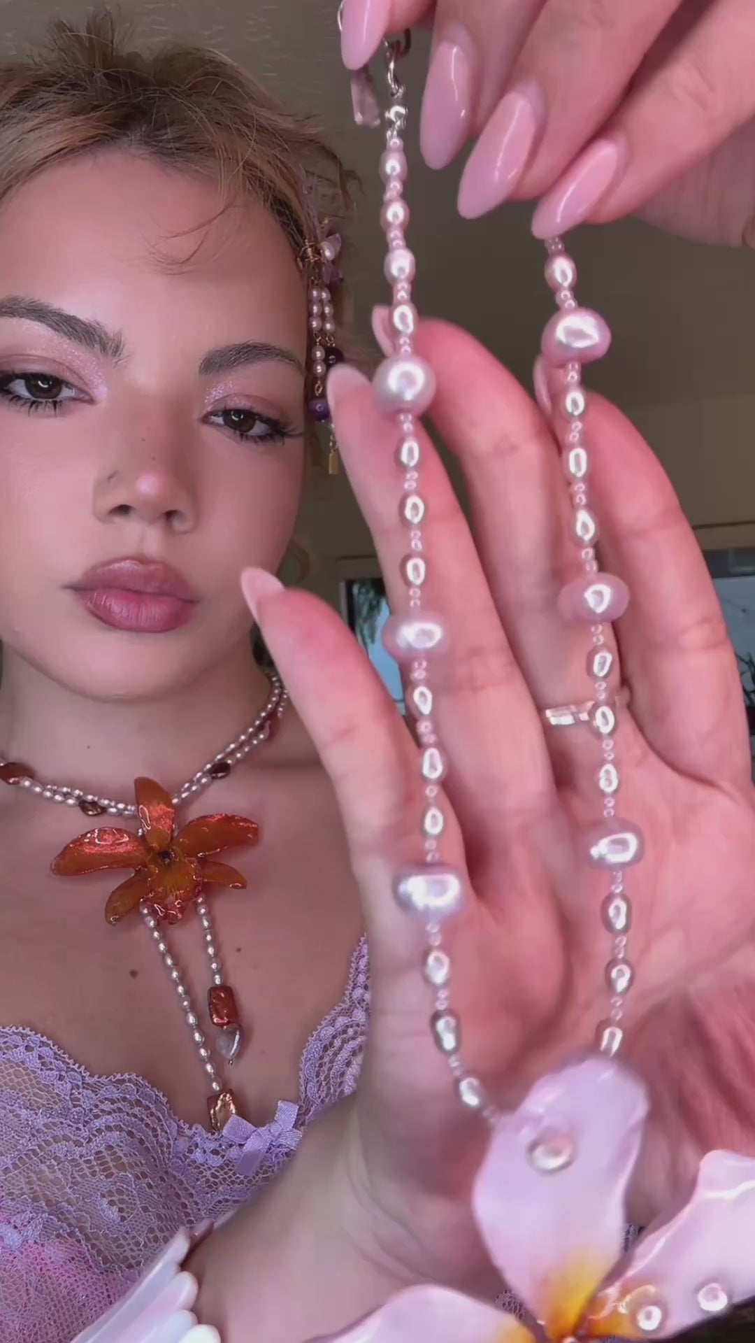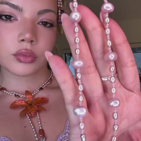 Acompañada de perlas auténticas de aguadulce en color rosa y cuarzo rosa, cuidadosamente seleccionados por su calidad y armonía.