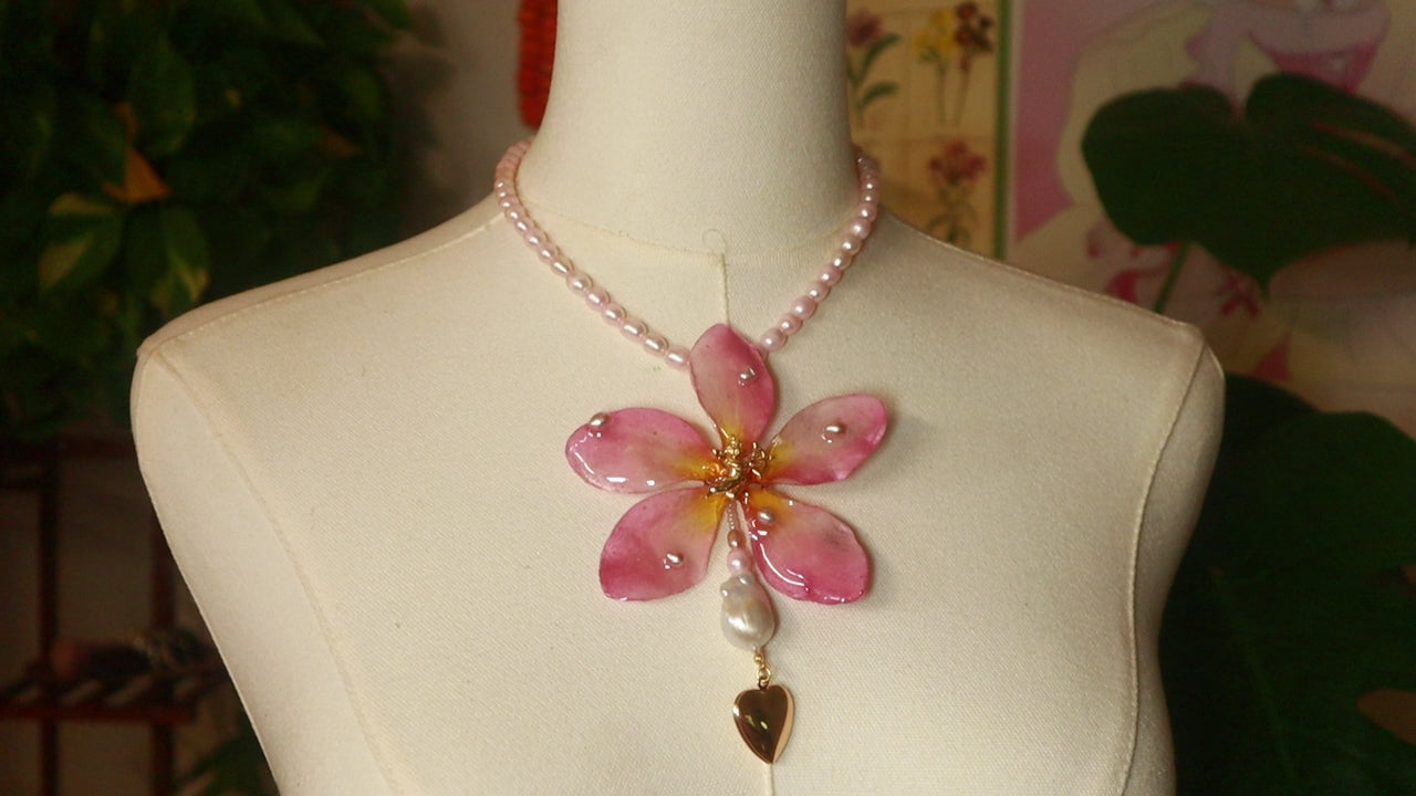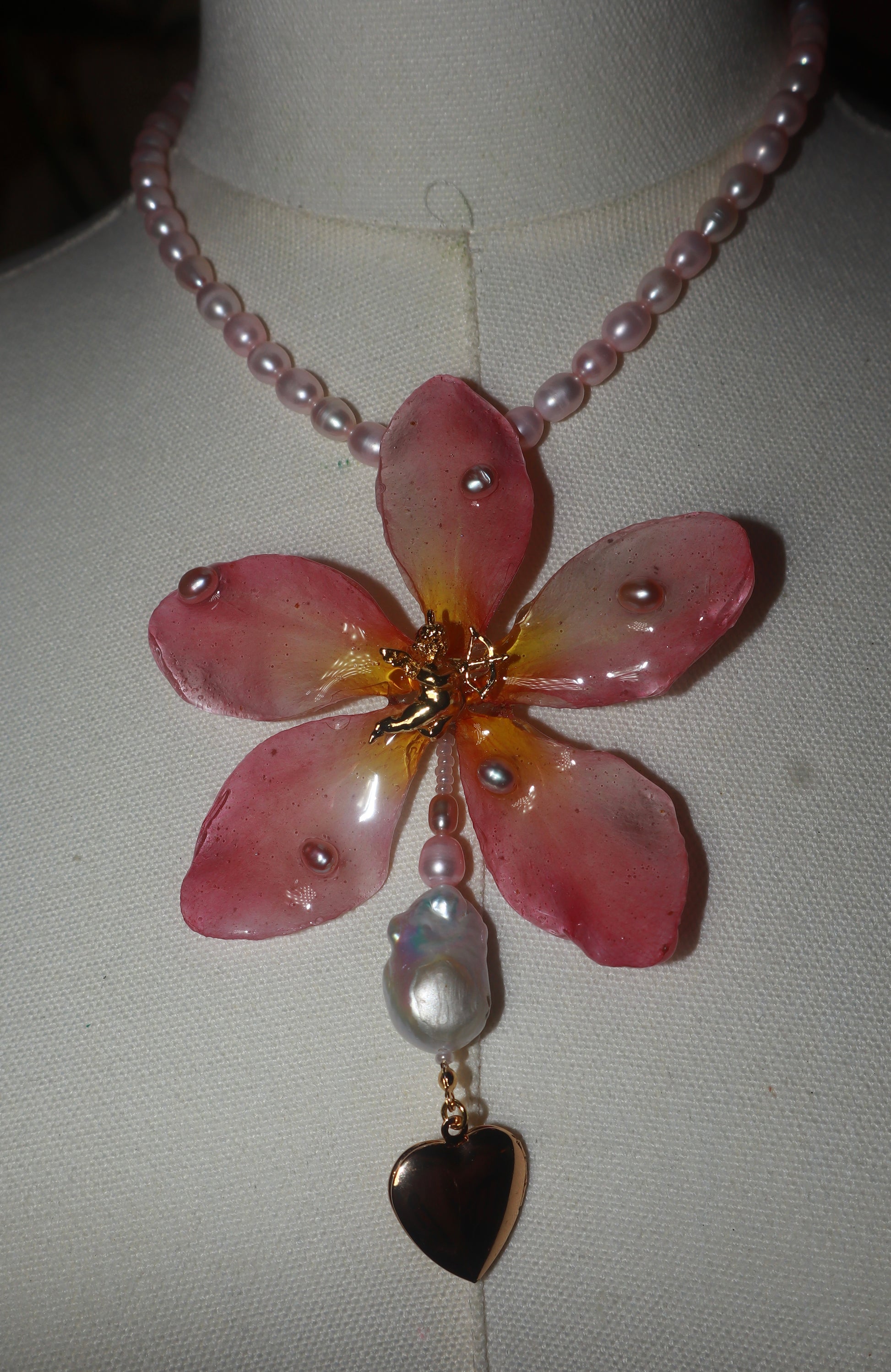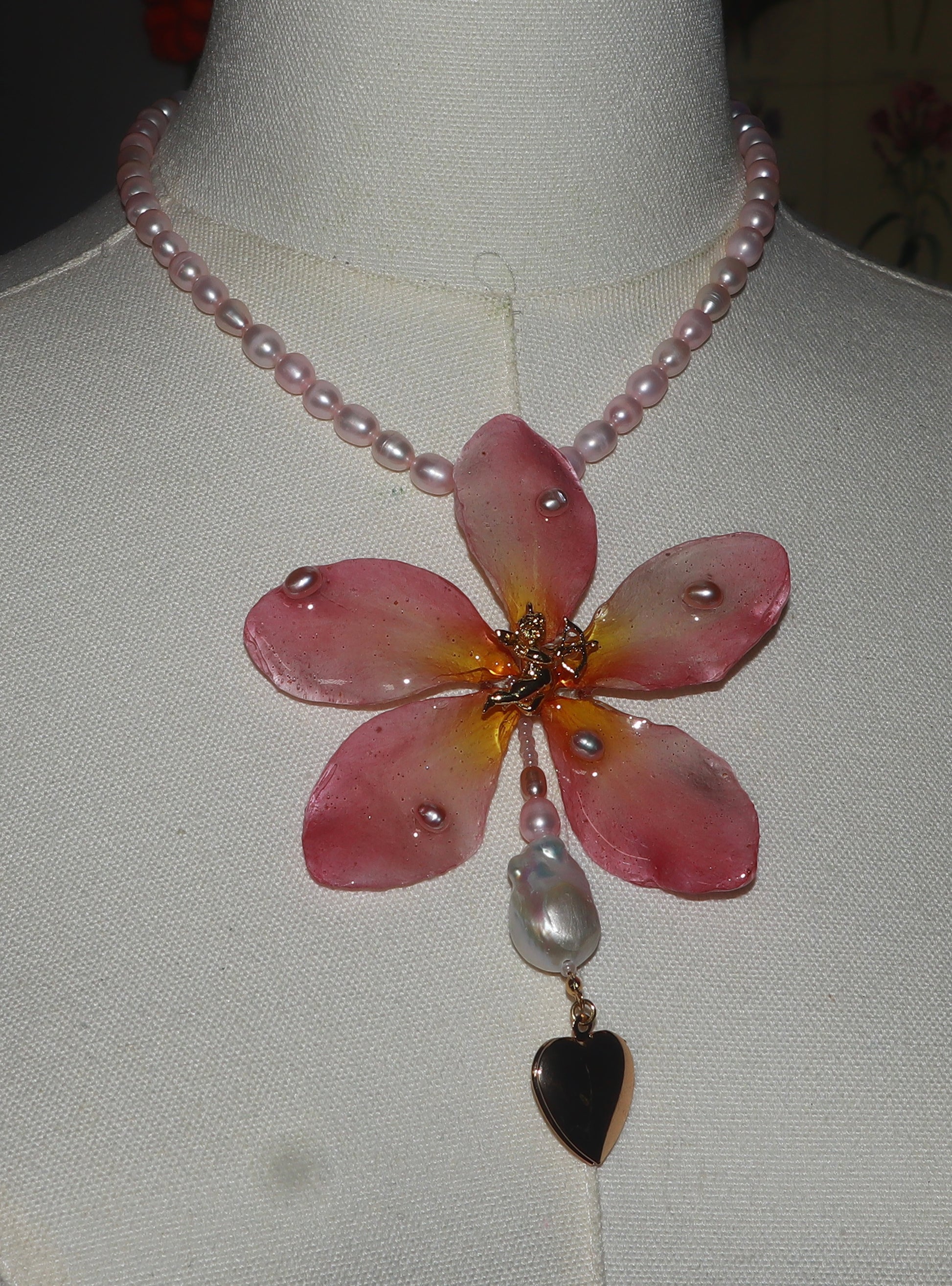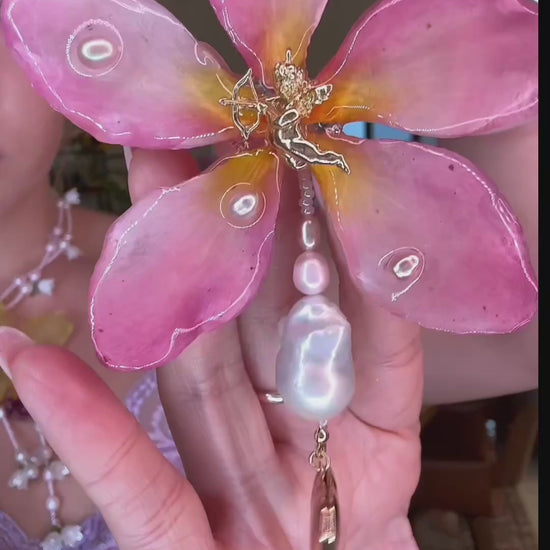 Plumeria real conservada en resina, acompañada de perlas de agua dulce en tonos rosados, perlas barrocas, un relicario en forma de corazón para guardar fotos y un querubín dorado.