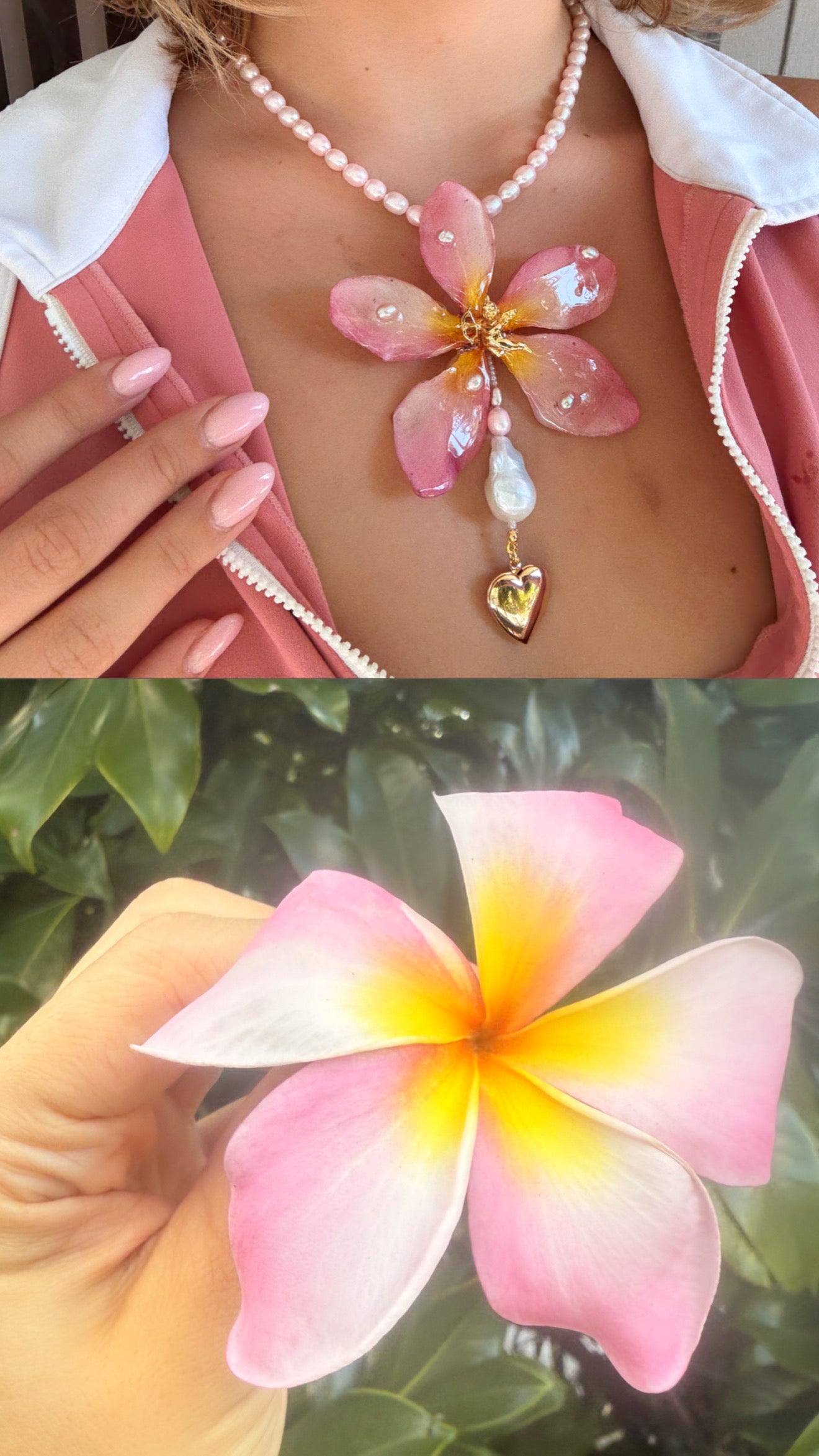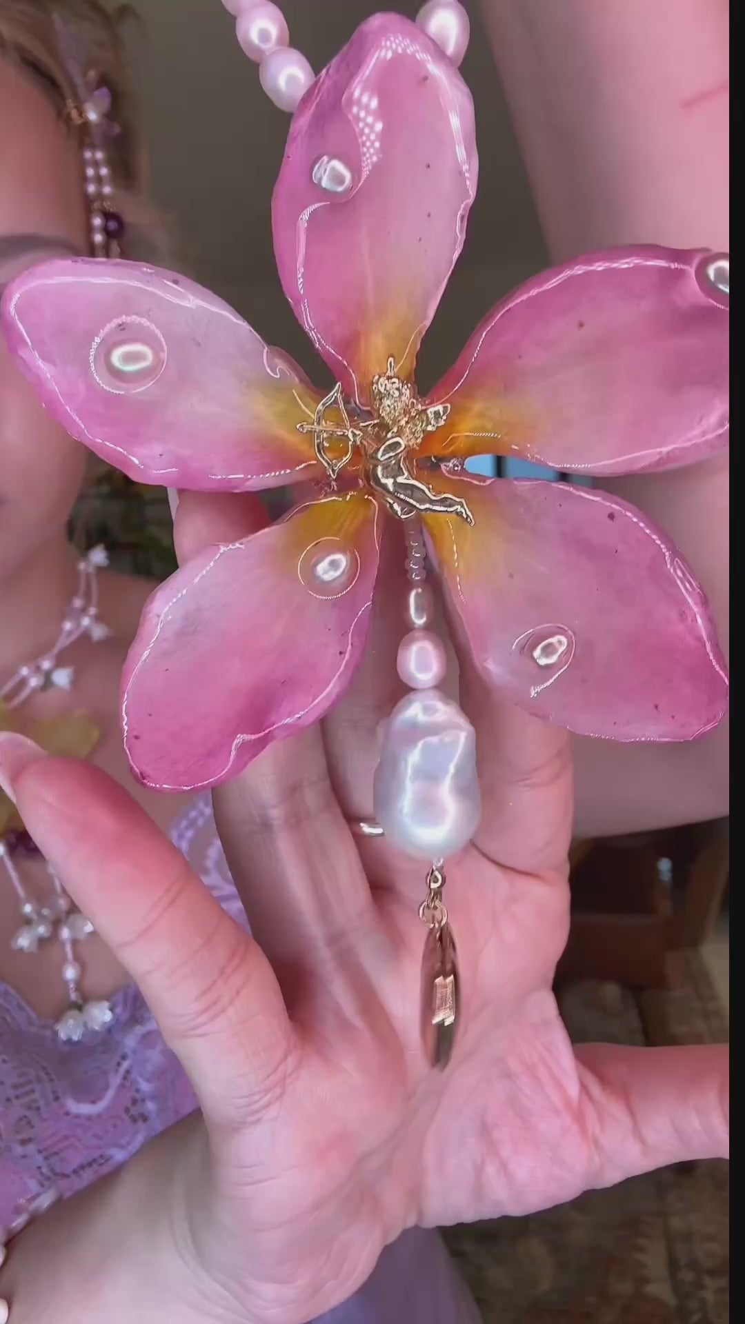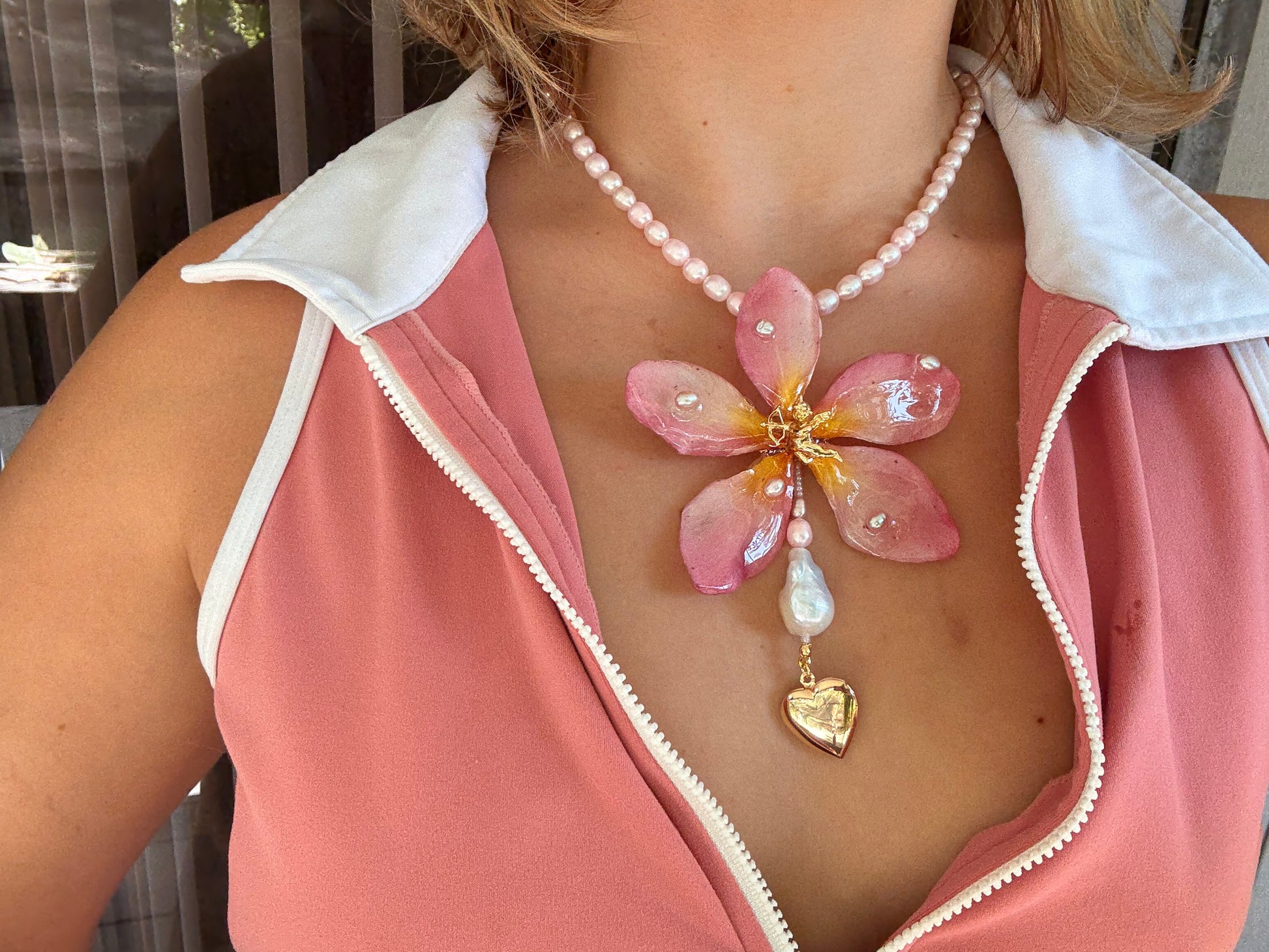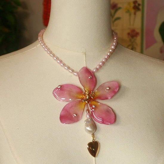 Plumeria real conservada en resina, acompañada de perlas de agua dulce en tonos rosados, perlas barrocas, un relicario en forma de corazón para guardar fotos y un querubín dorado.