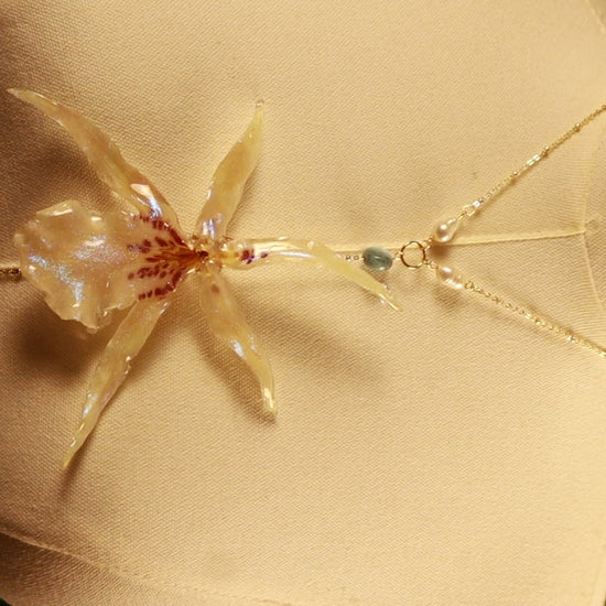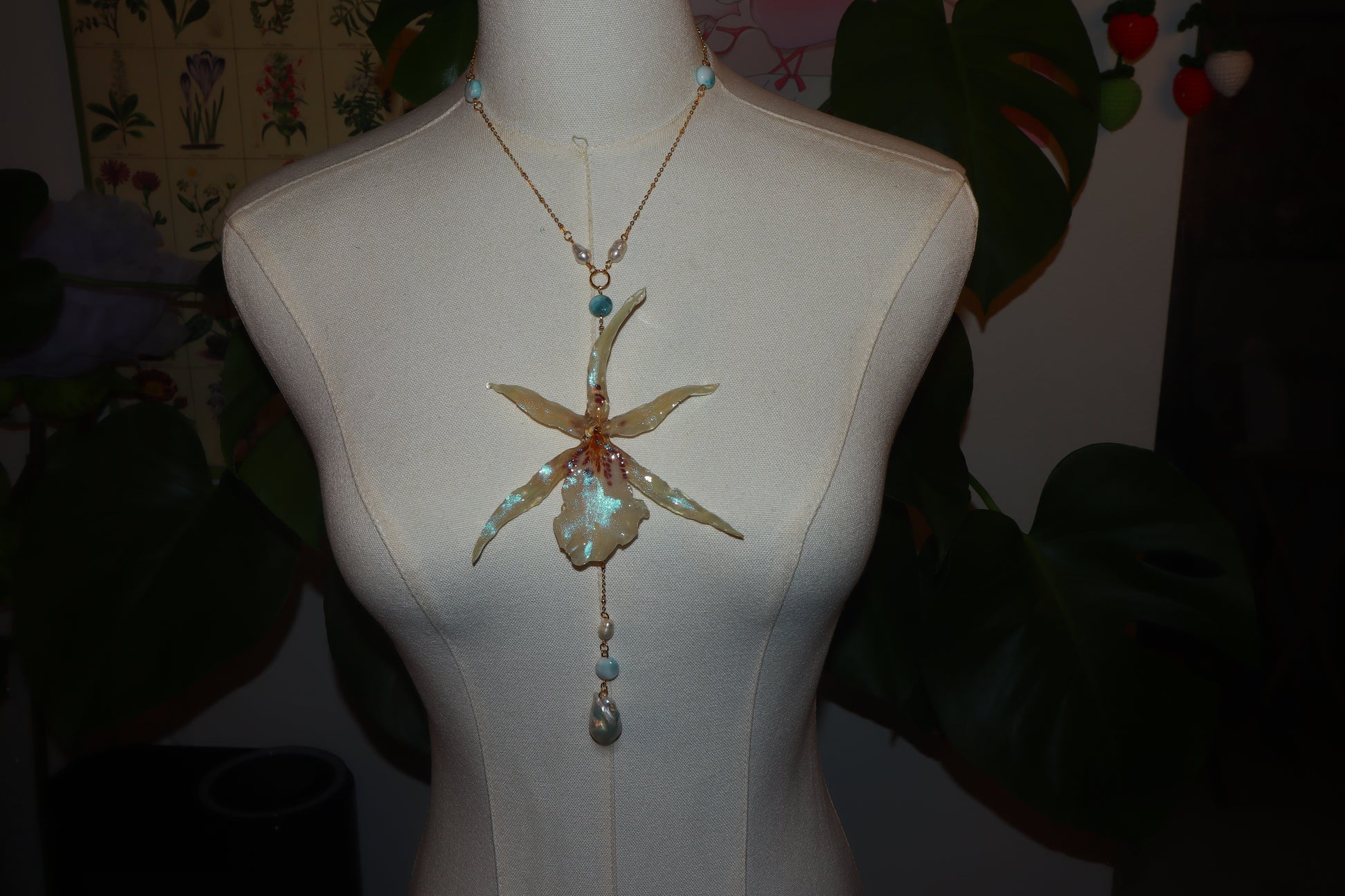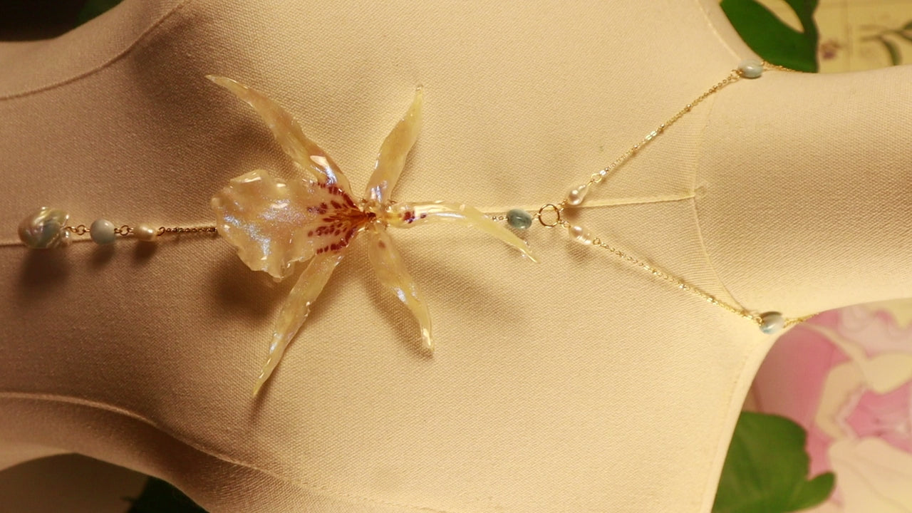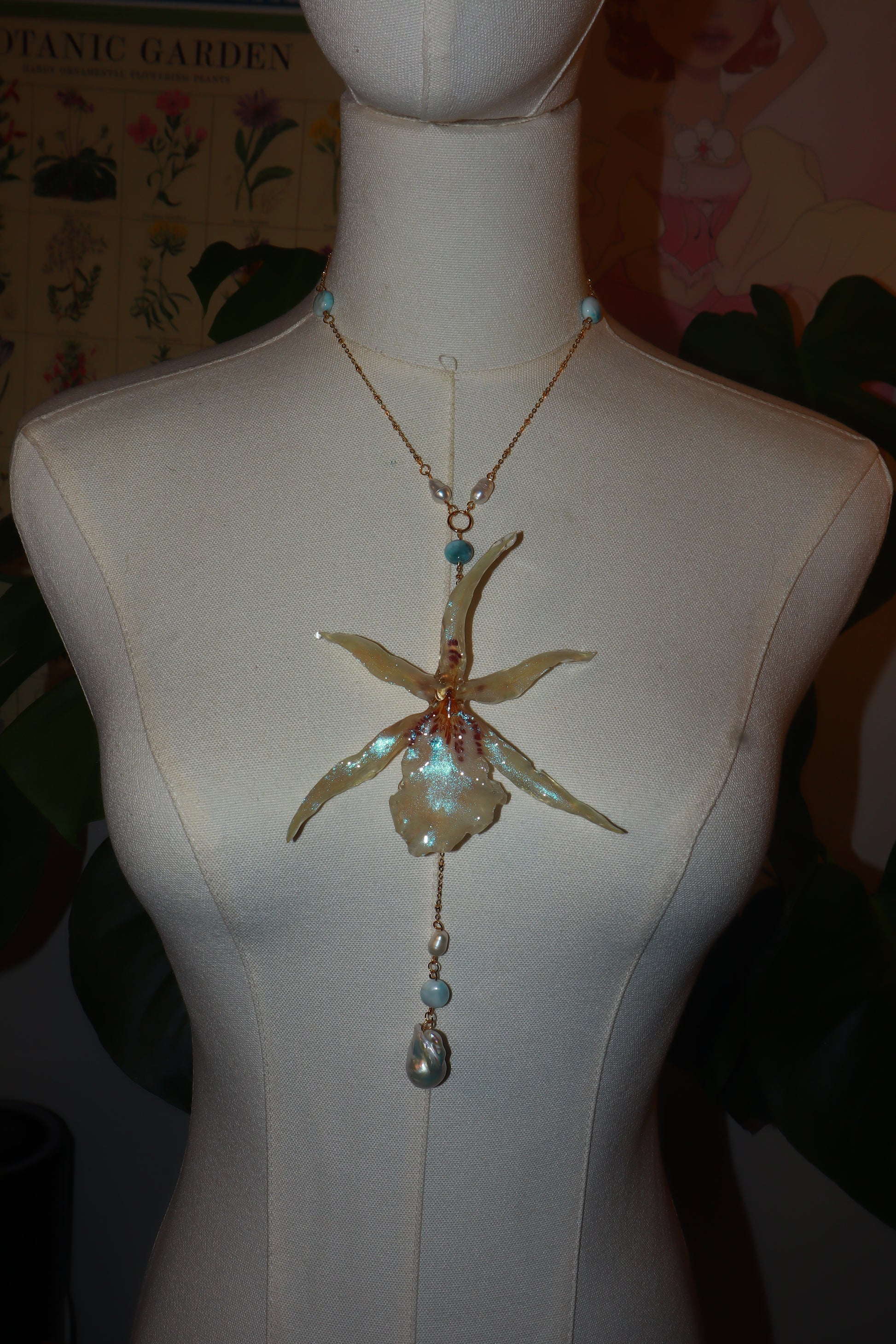 orquídea exótica conservada en resina, perlas de aguadulce & Larimar