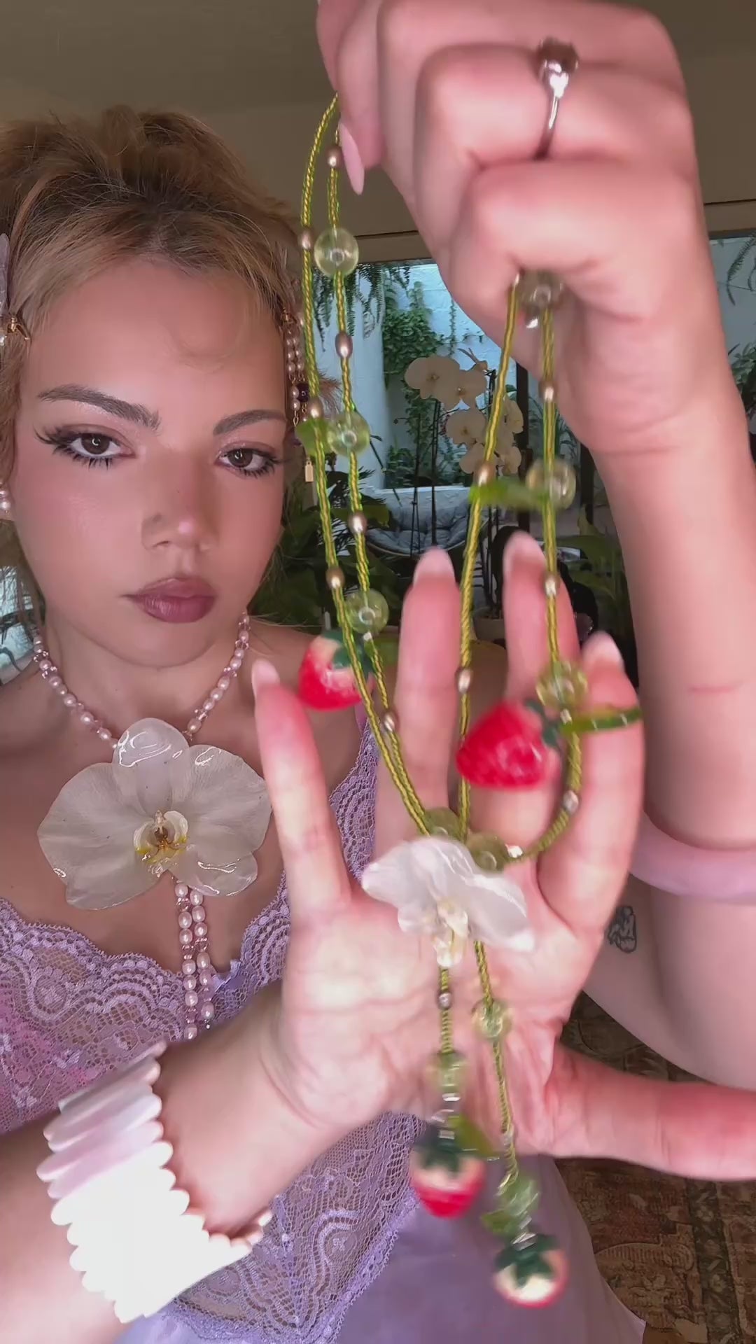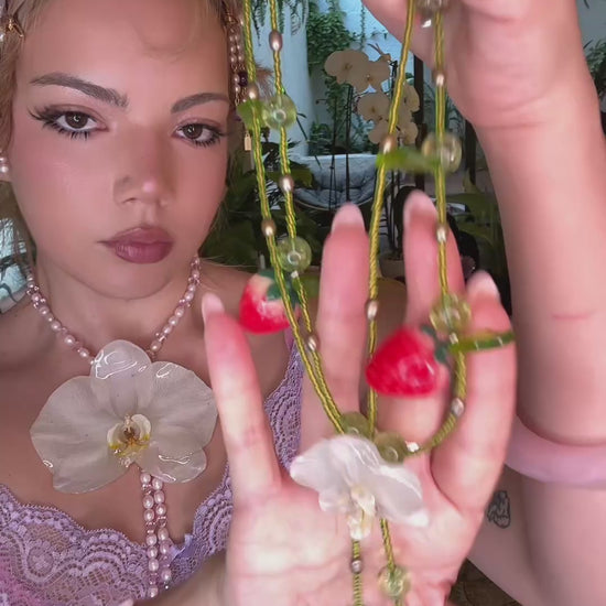 La pieza incluye dijes en forma de fresa, dijes en forma de hojitas y perlas de agua dulce en tonos oliva.