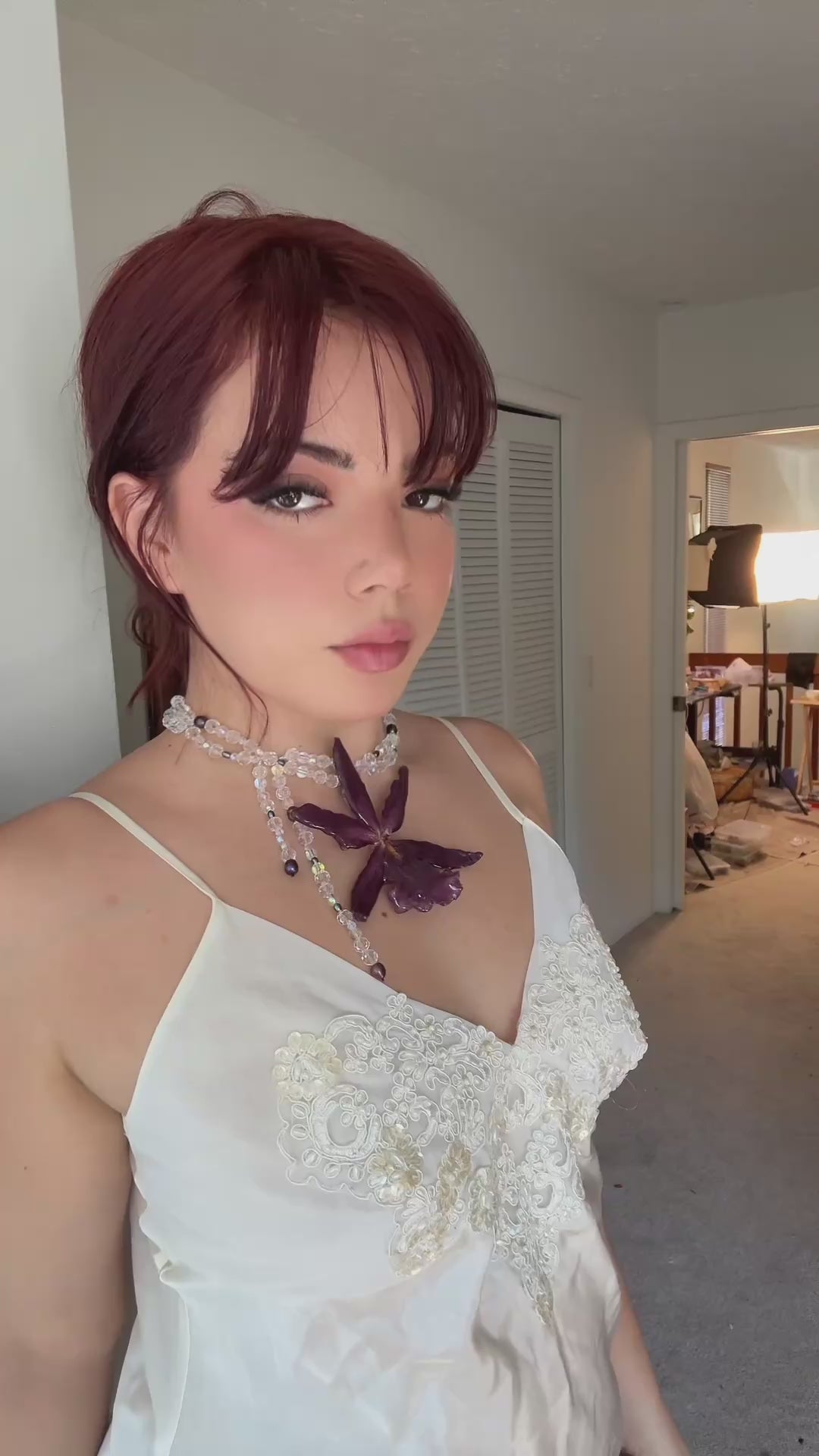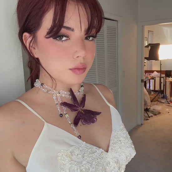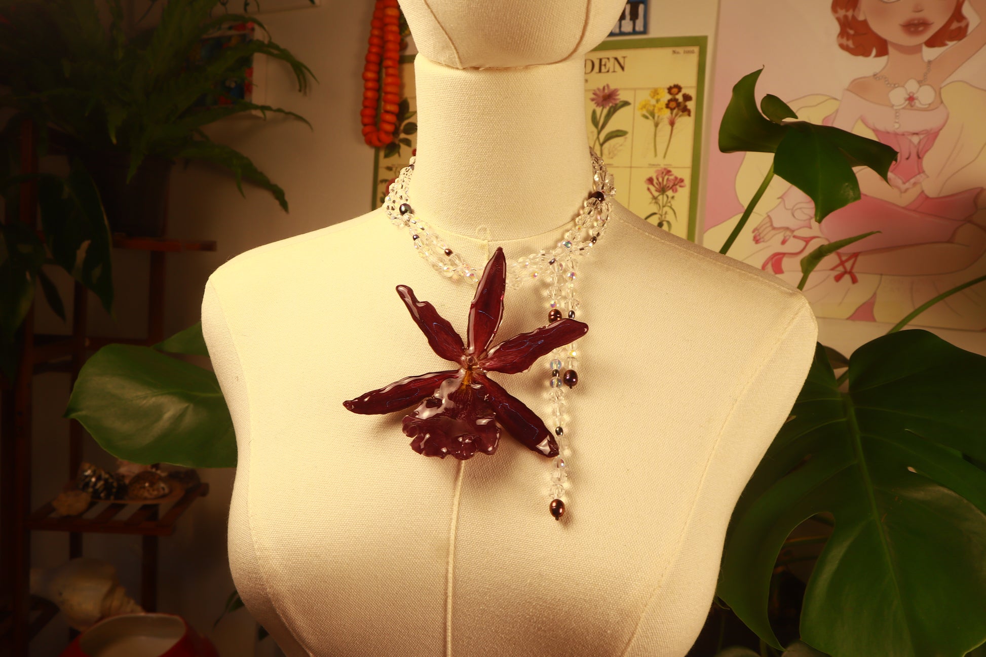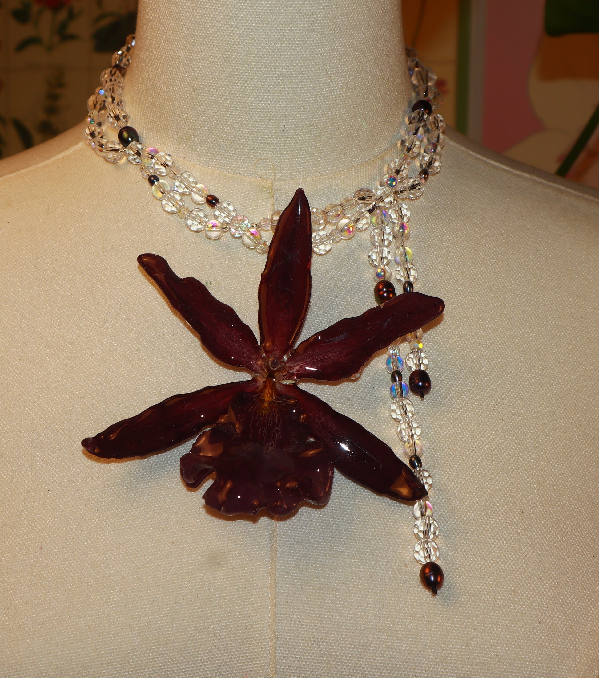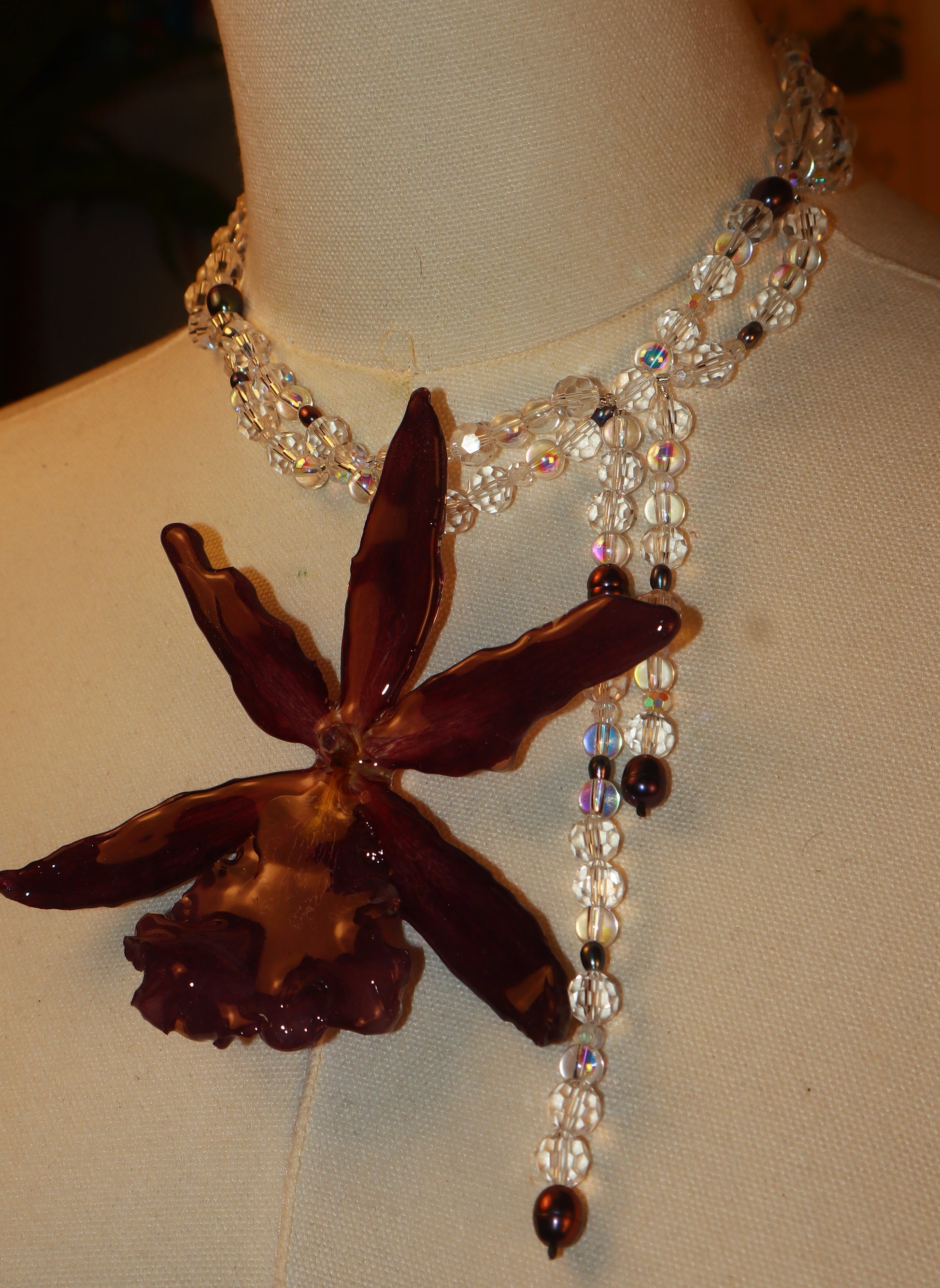 Orquídea Exótica conservada en resina, perlas de aguadulce color Pavo Real y Cuentas de vidrio.