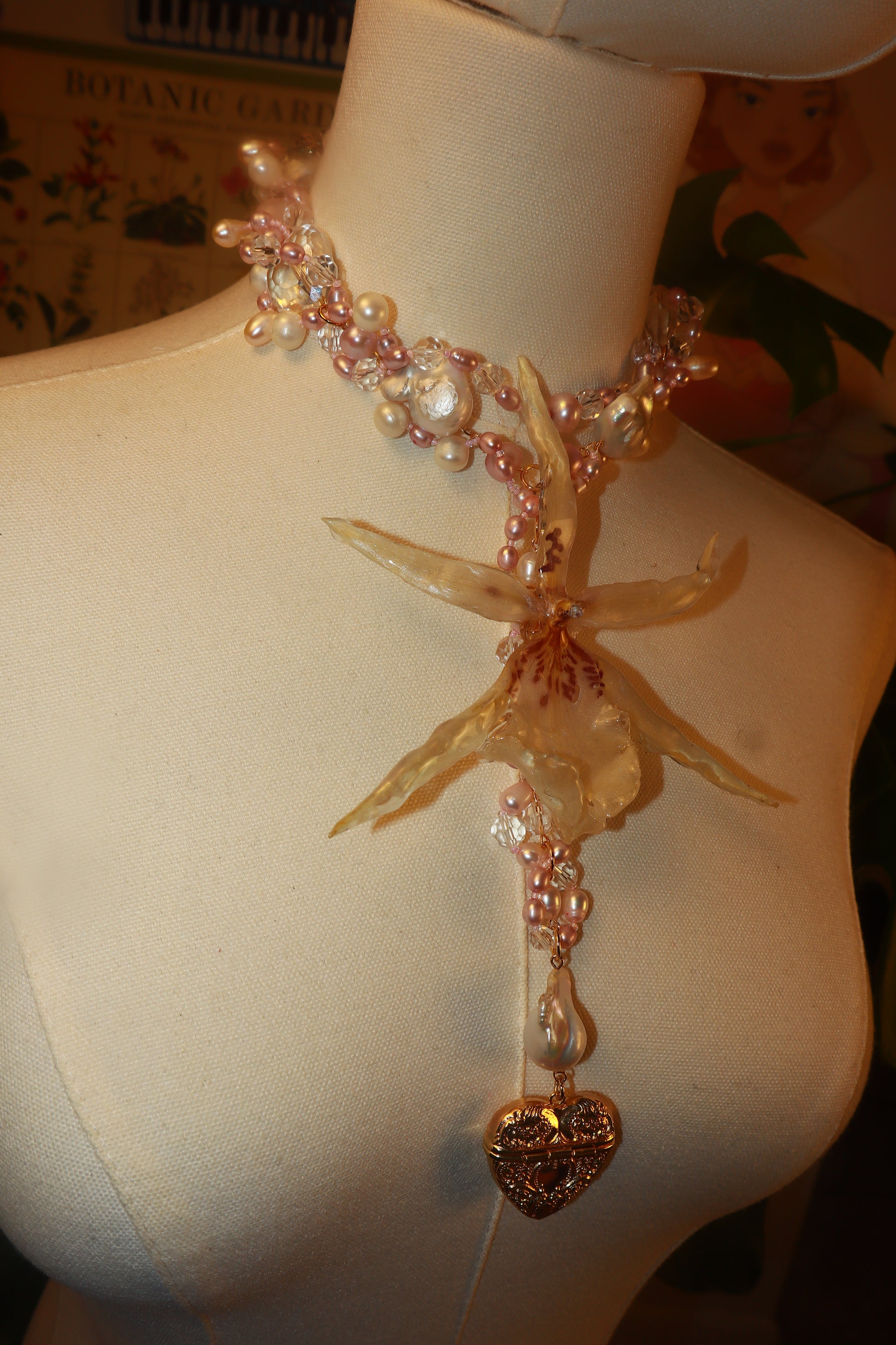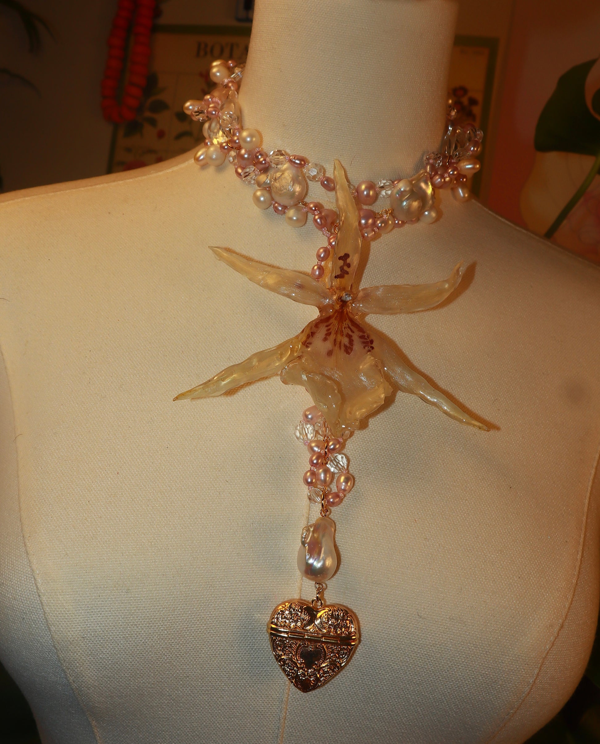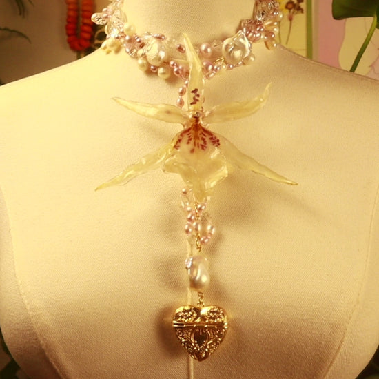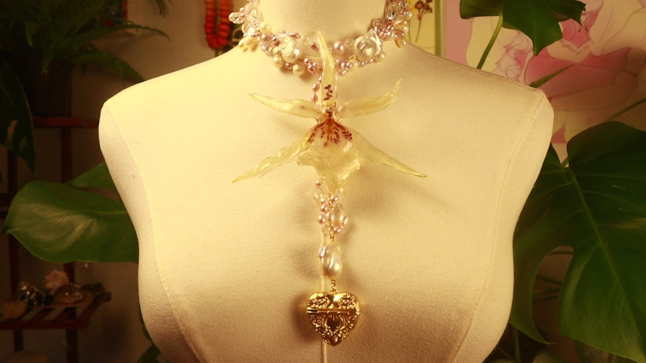 Orquídea Exótica conservada en resina, perlas de aguadulce de diferentes tonalidades y tamaños, cuentas de vidrio de diferentes tamaños, pendiente de corazón bañado en oro 14K.