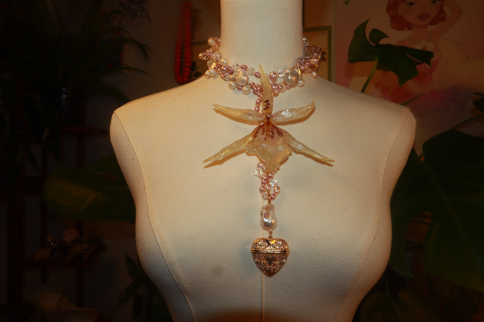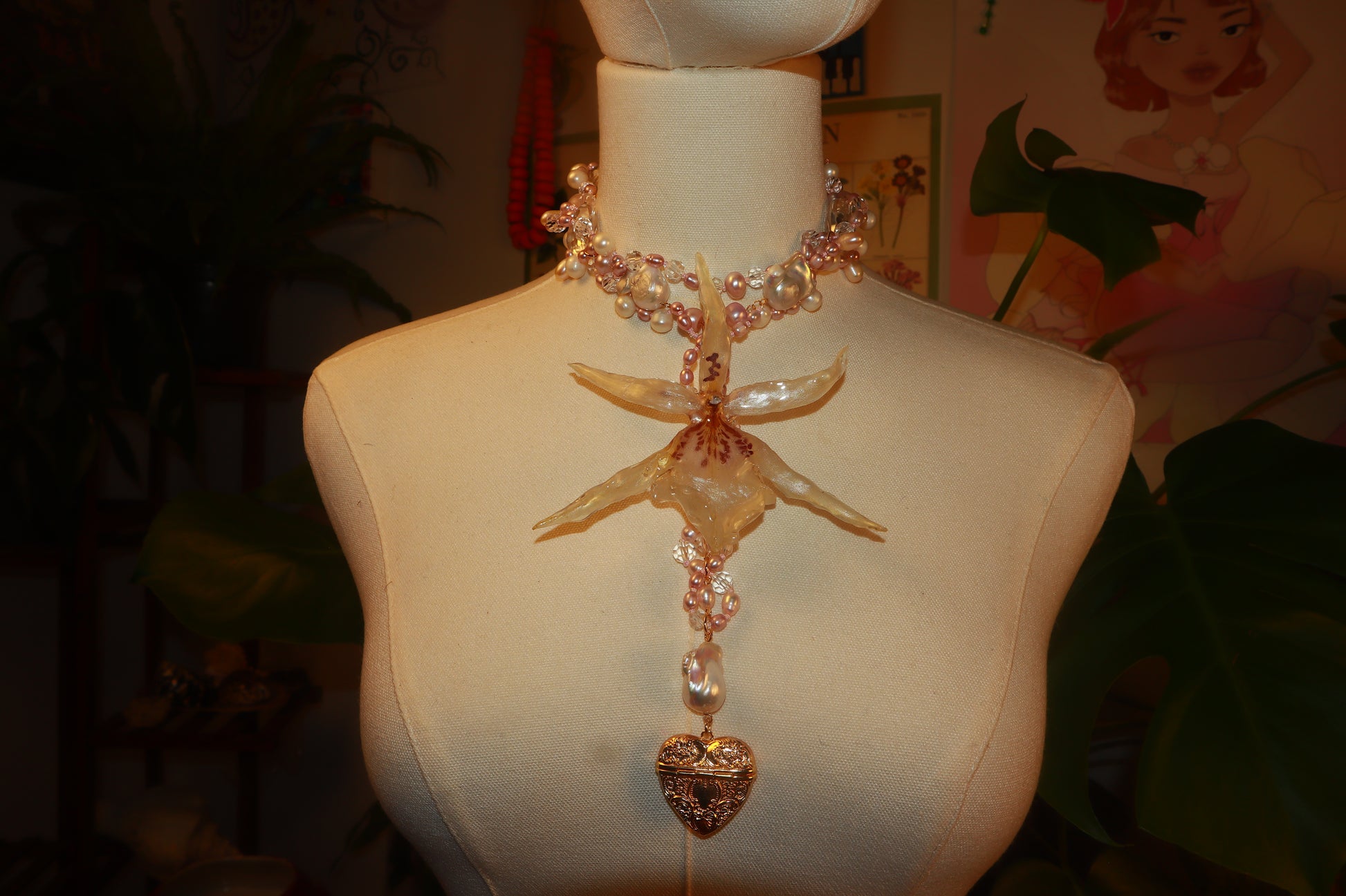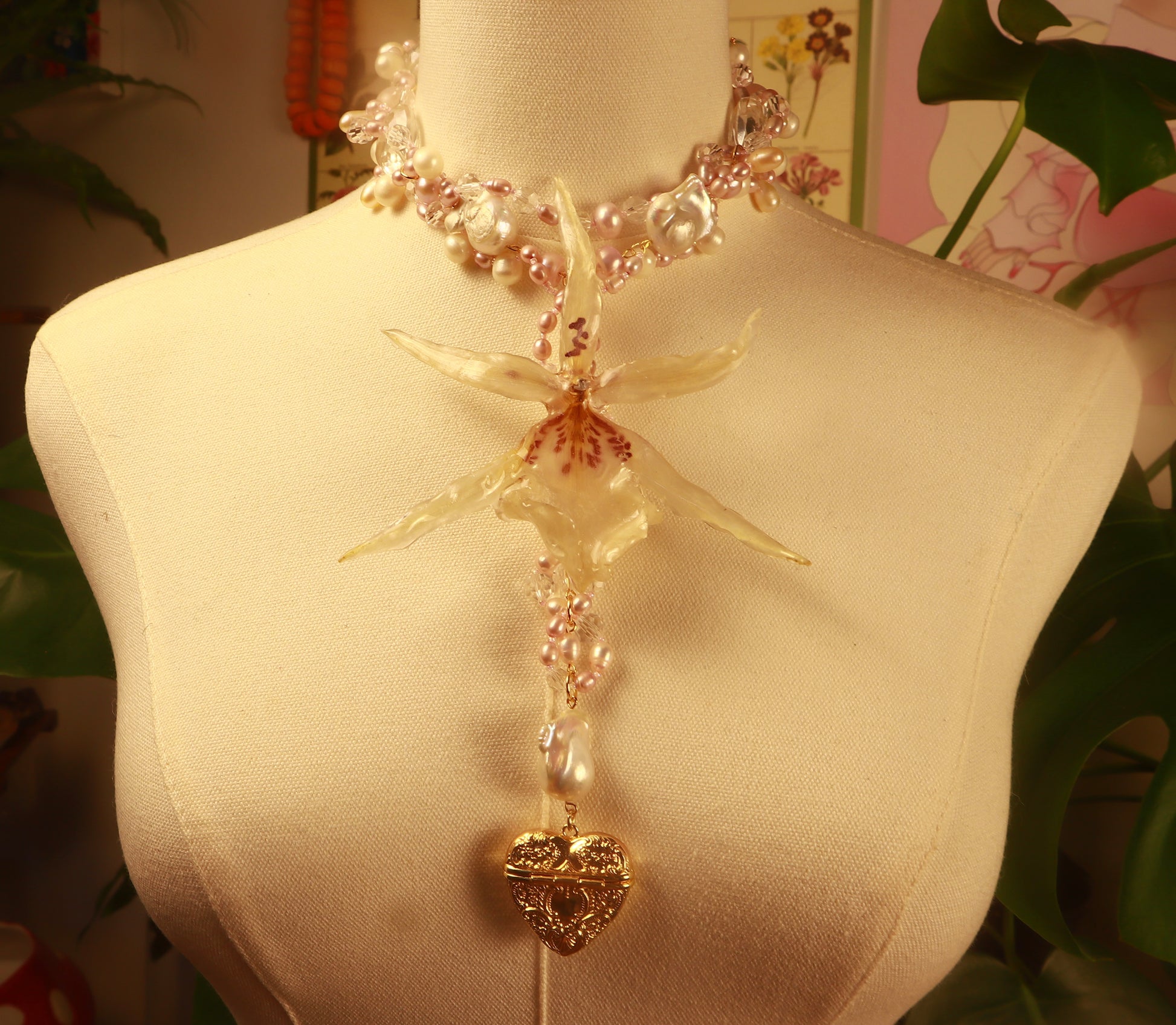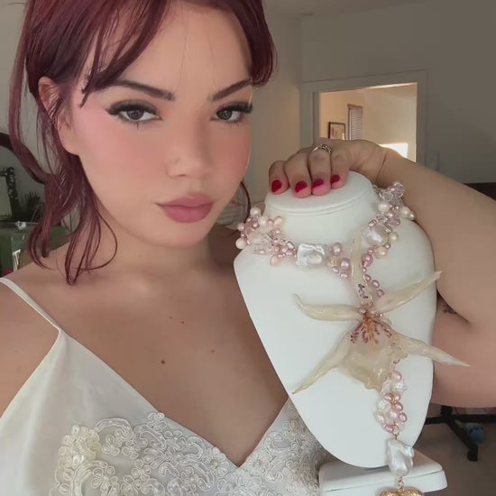 Orquídea Exótica conservada en resina, perlas de aguadulce de diferentes tonalidades y tamaños, cuentas de vidrio de diferentes tamaños, pendiente de corazón bañado en oro 14K.