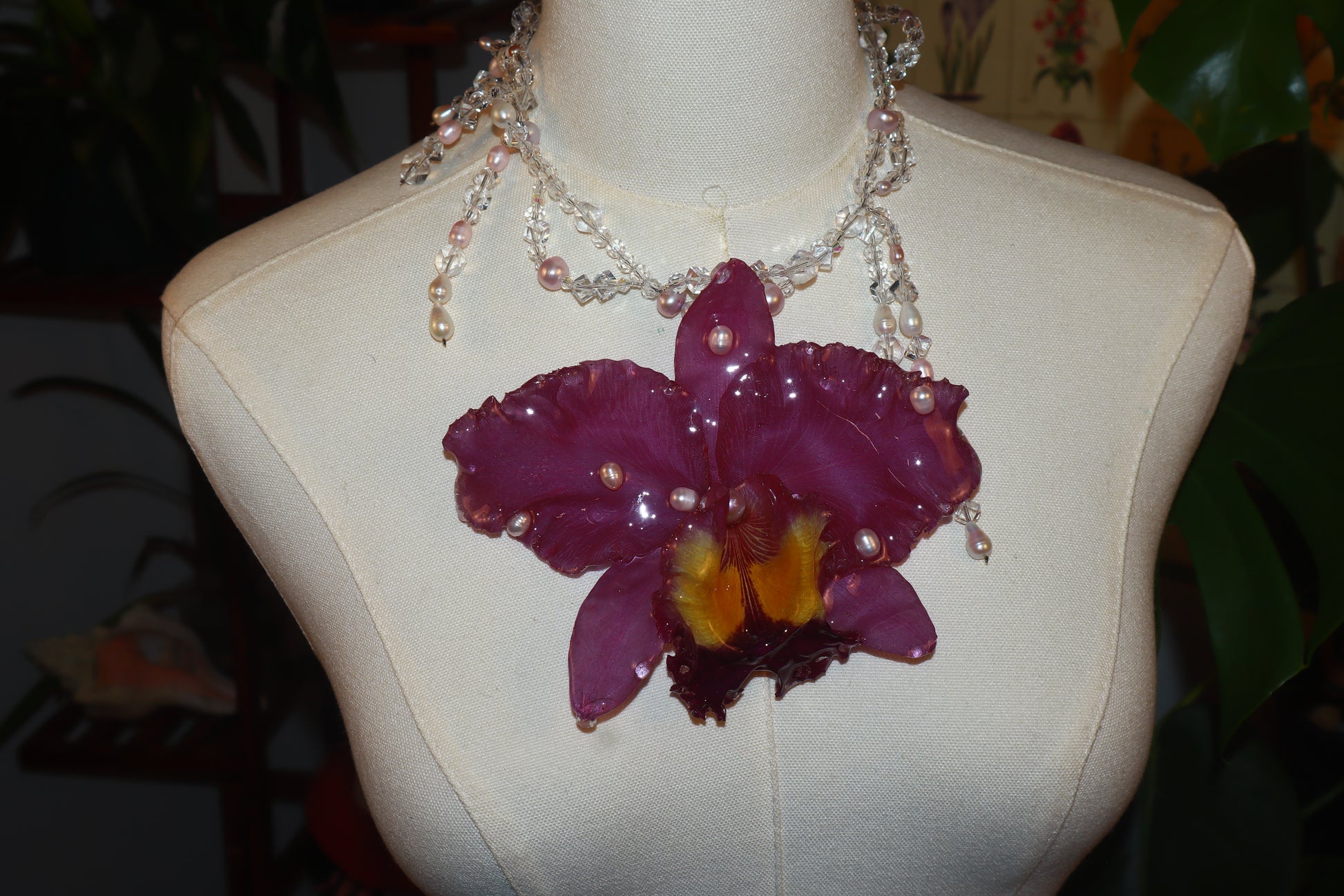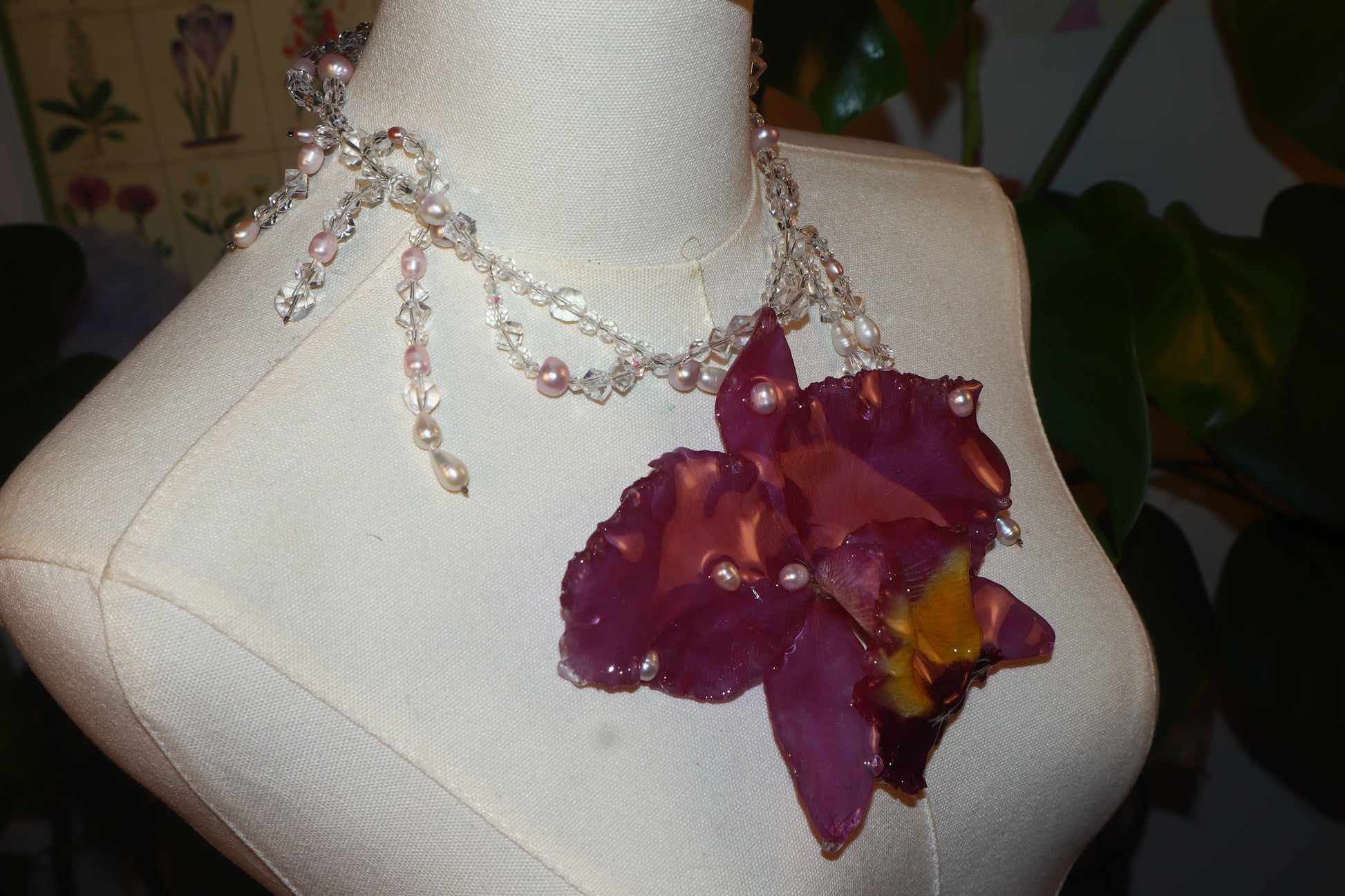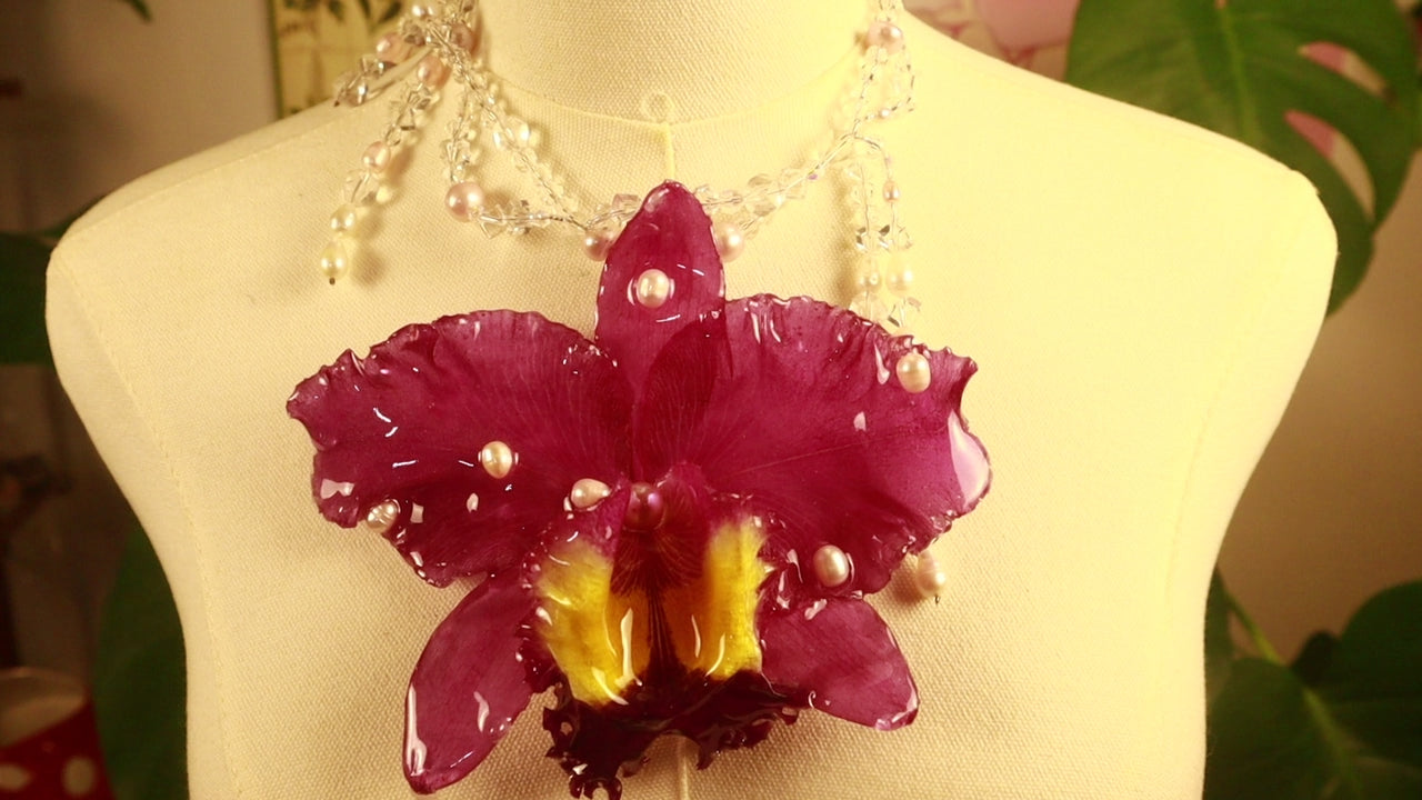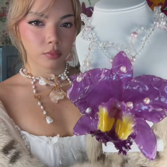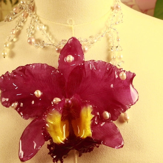 Cattleya Gigante conservada en resina, perlas de aguadulce calidad AAA, cuentas de vidrio & cuentas de cuarzo cristal