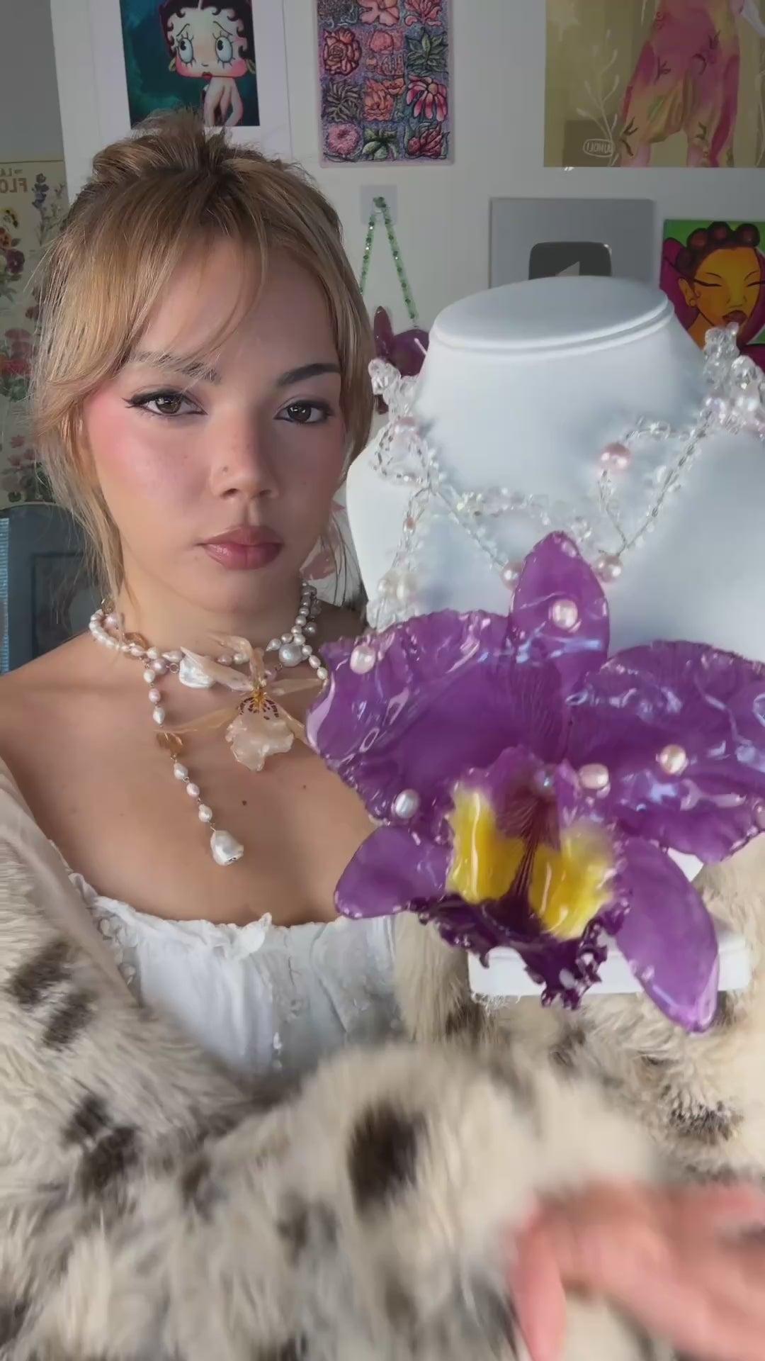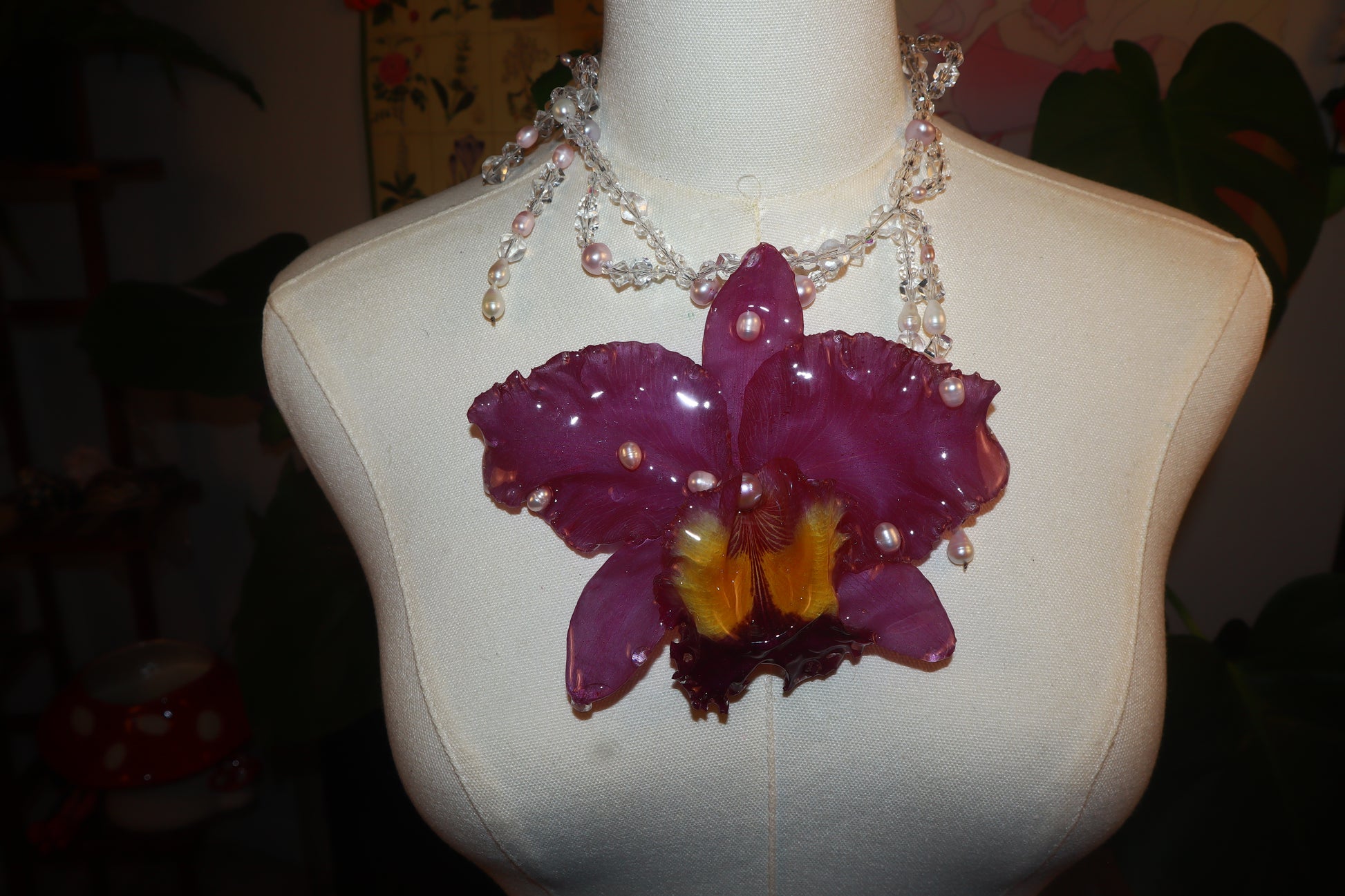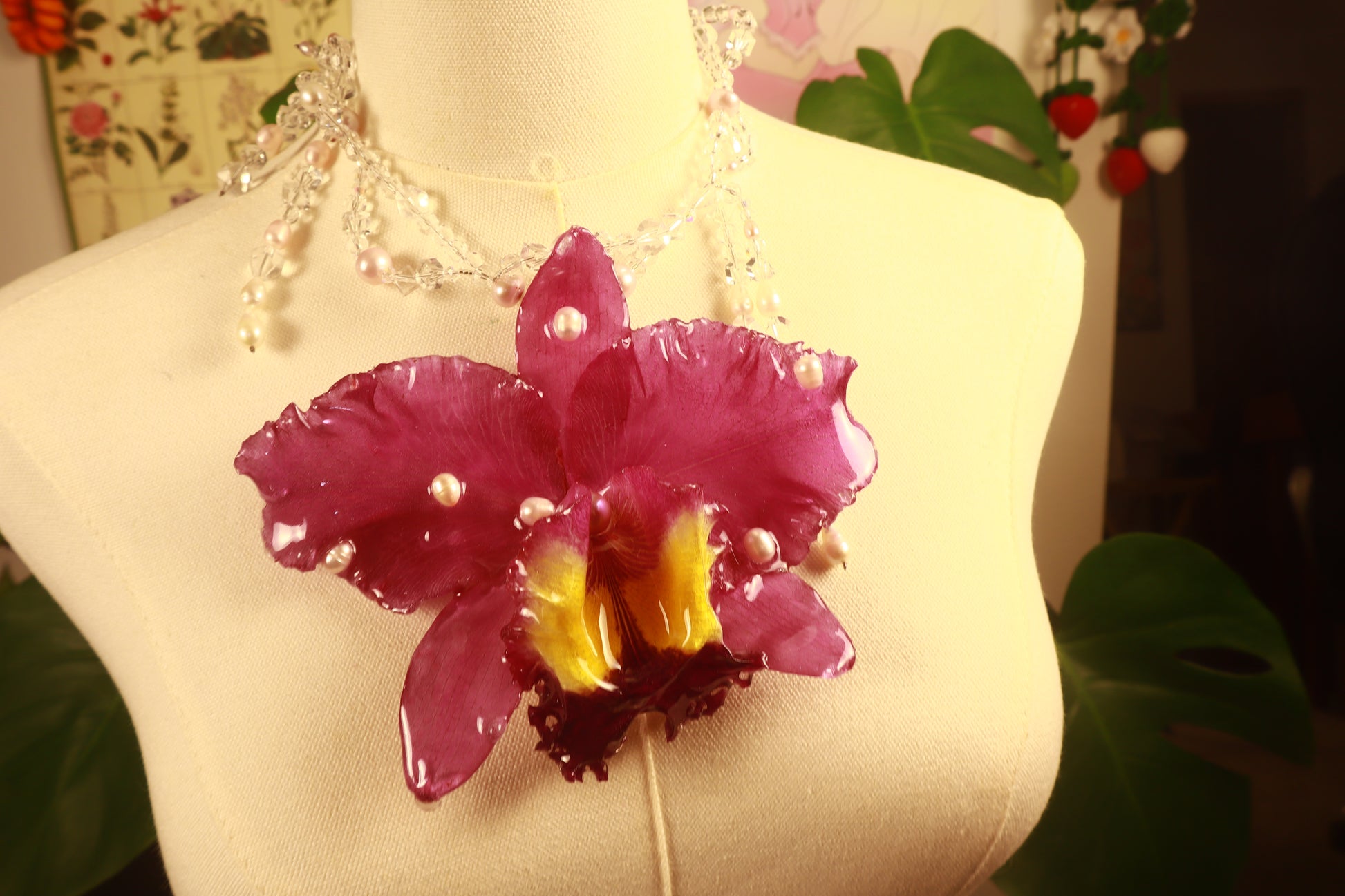 Cattleya Gigante conservada en resina, perlas de aguadulce calidad AAA, cuentas de vidrio & cuentas de cuarzo cristal